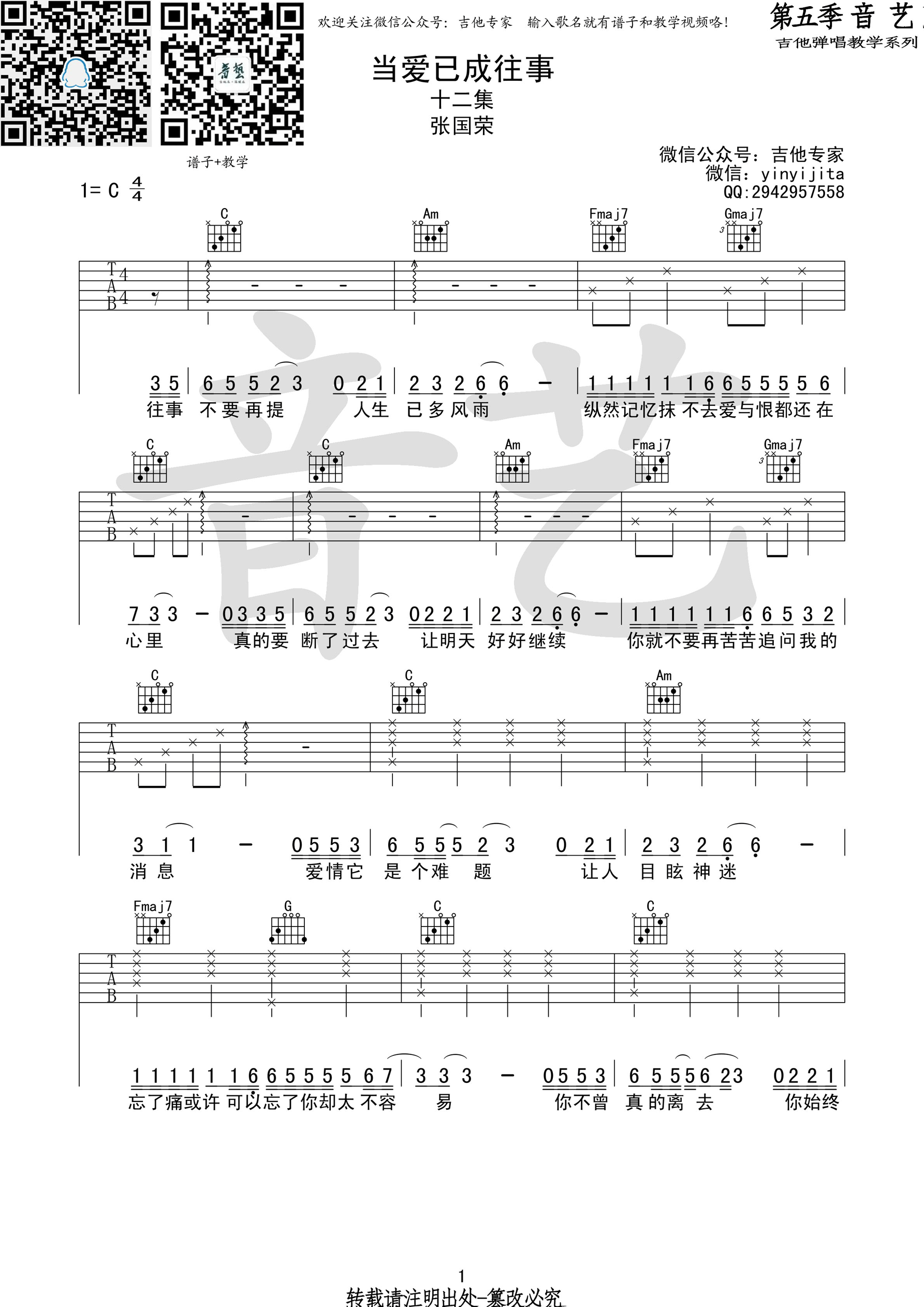 曲谱介绍: 张国荣《当爱已成往事》吉他弹唱谱,采用C调指法编配,共有3张高清图谱。