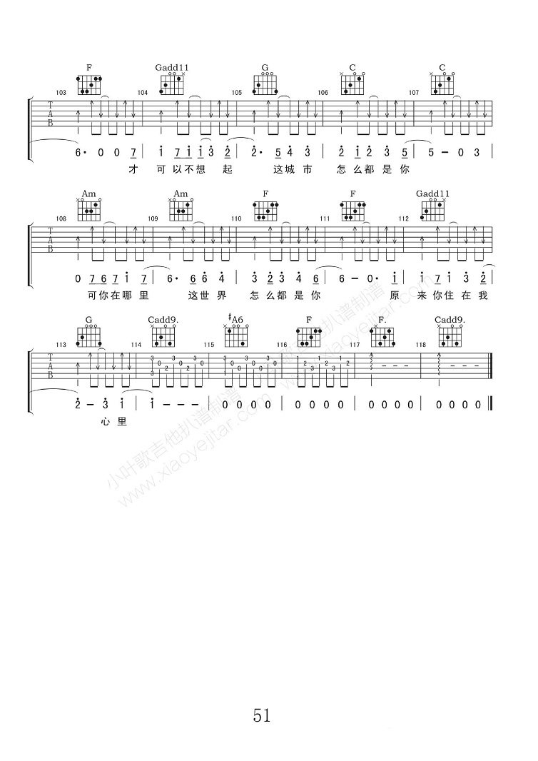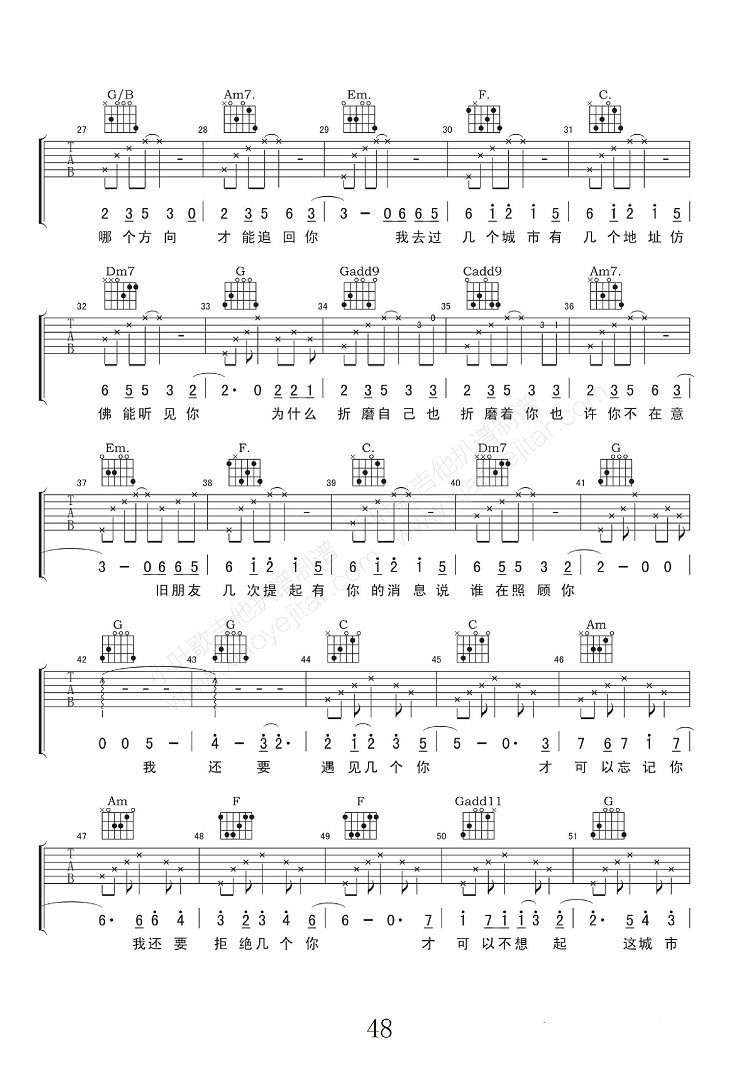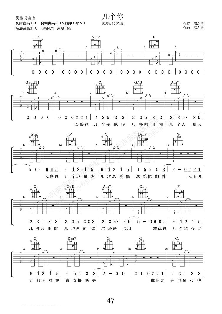 曲谱介绍: 薛之谦《几个你》吉他弹唱谱,采用C调指法编配,共有5张高清图谱。