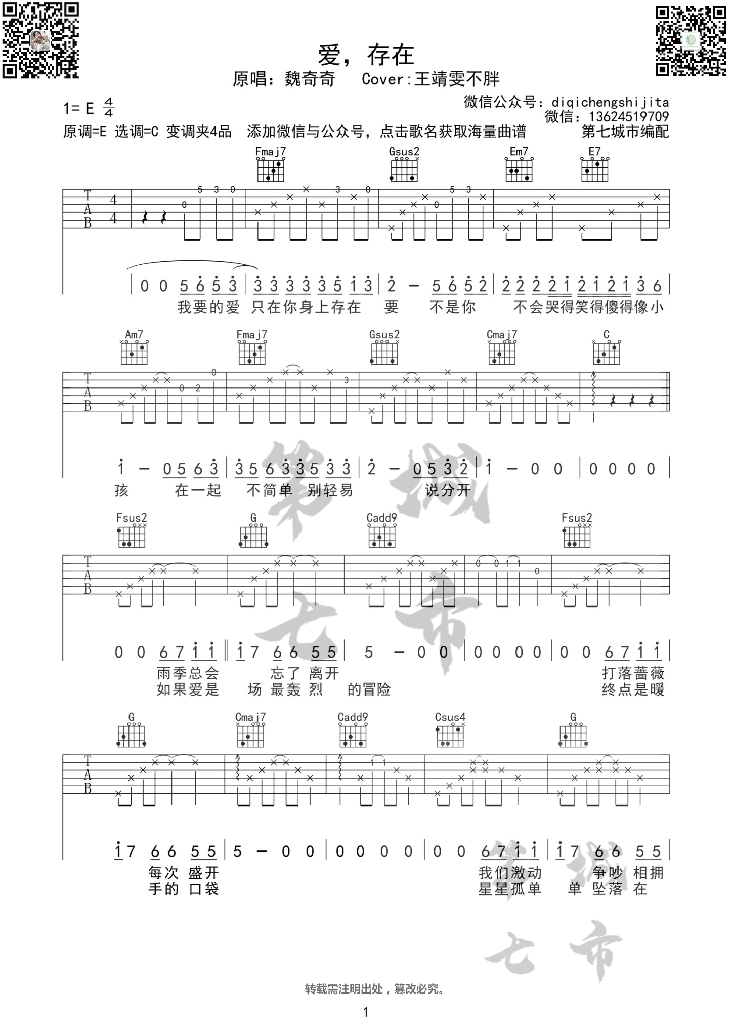 曲谱介绍: 魏奇奇/王靖雯不胖《爱存在》吉他弹唱谱,采用C调指法编配,共有3张高清图谱。
