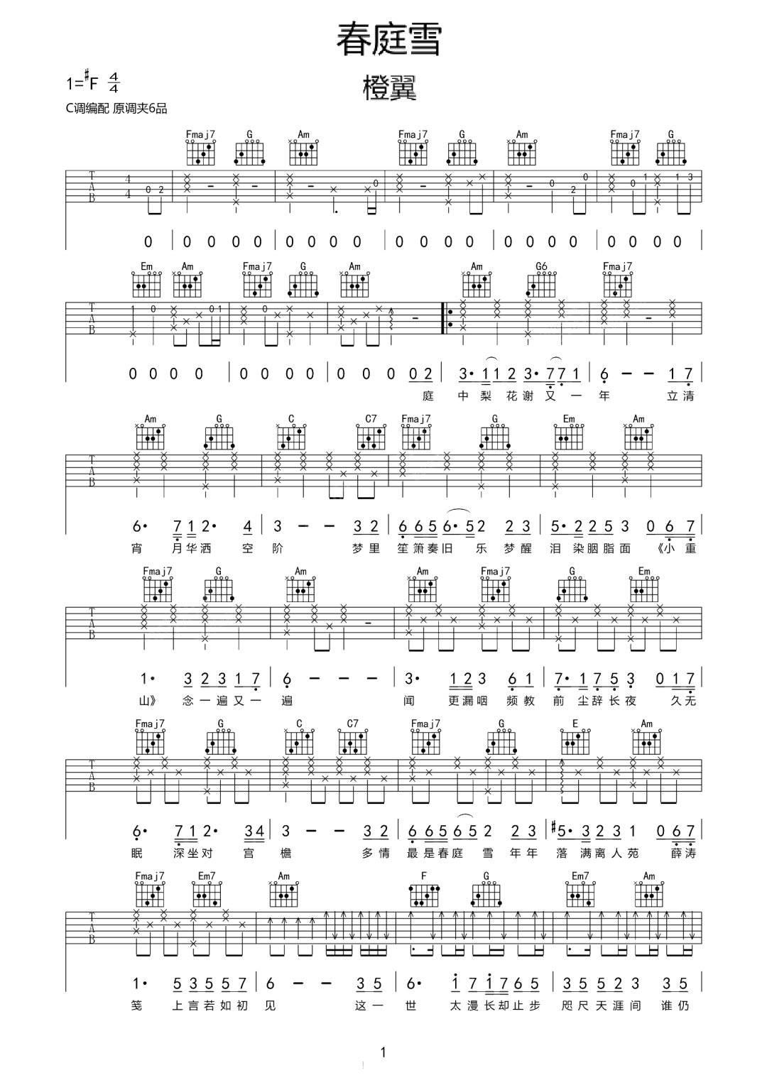 曲谱介绍: 橙翼《春庭雪》吉他弹唱谱,采用C调指法编配,共有2张高清图谱,免翻页排版设计。
