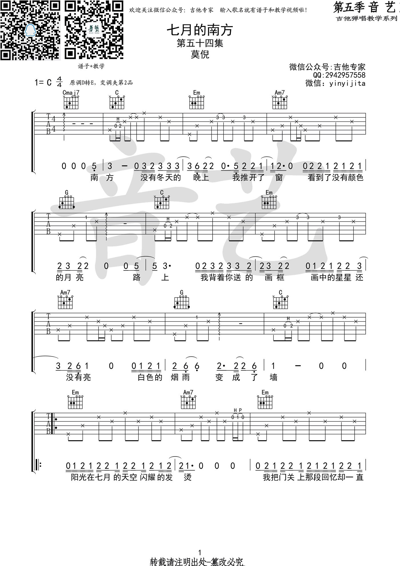 曲谱介绍: 莫倪《七月的南方》吉他弹唱谱,采用C调指法编配,共有3张高清图谱。