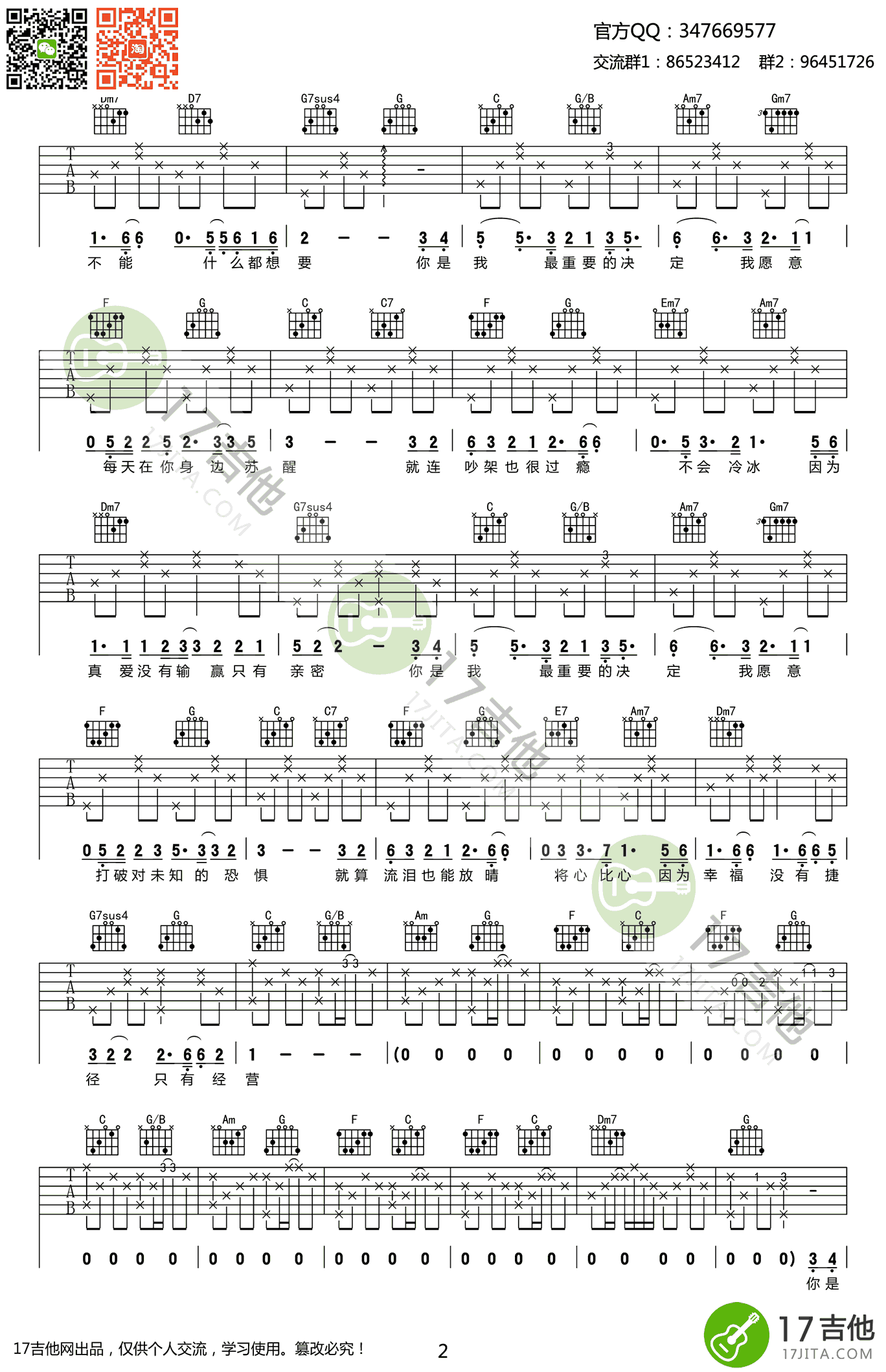 曲谱介绍: 范玮琪《最重要的决定》吉他弹唱谱,采用C调指法编配,共有3张高清图谱。