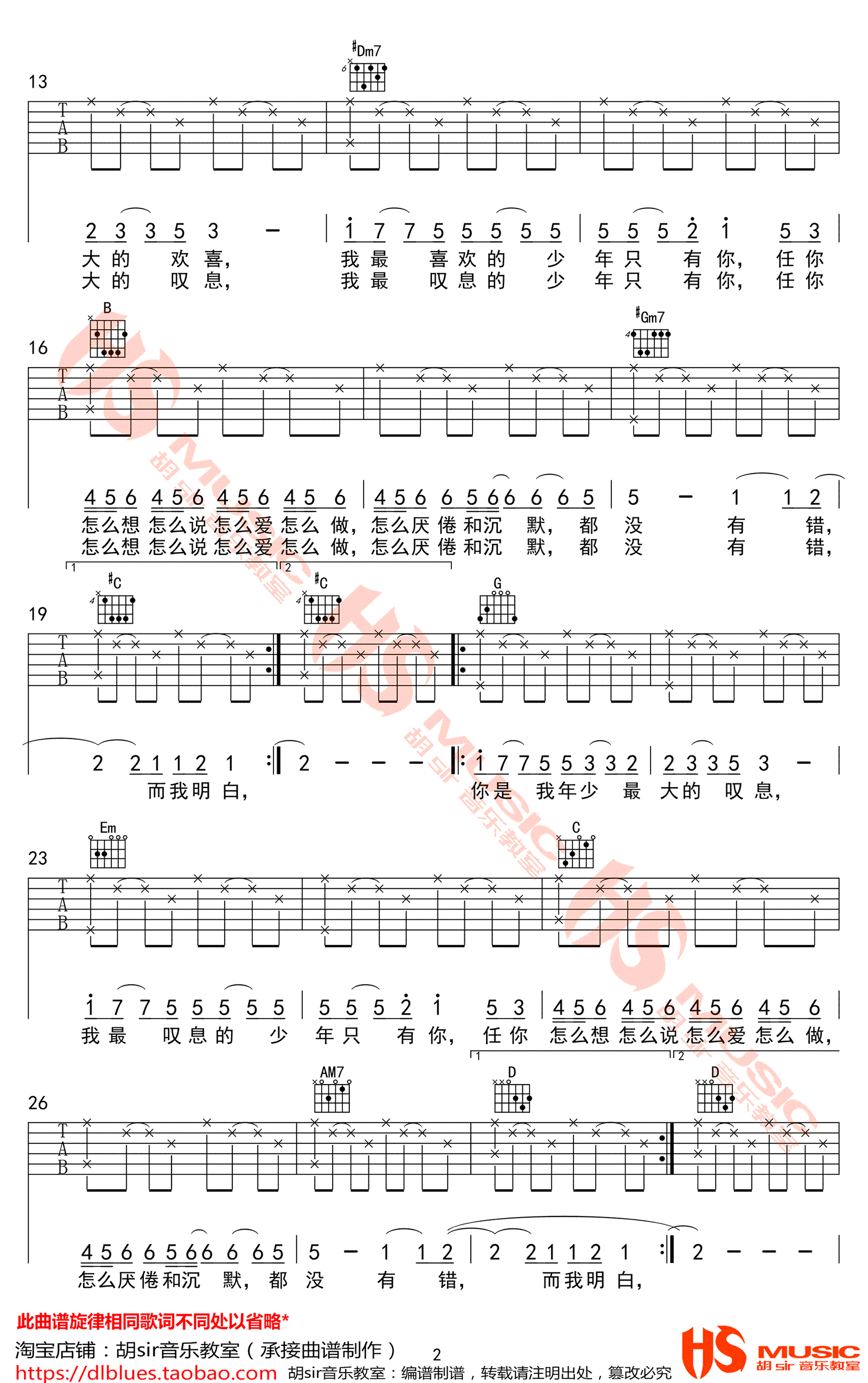 曲谱介绍: 孟大C《你是年少的欢喜》吉他弹唱谱,采用C调指法编配,共有2张高清图谱,免翻页排版设计。