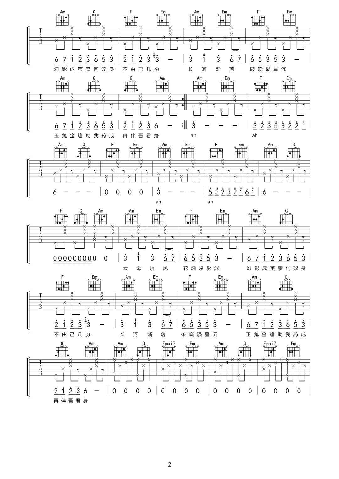 曲谱介绍: 丸子呦《广寒宫》吉他弹唱谱,采用C调指法编配原版,共有3张高清图谱。