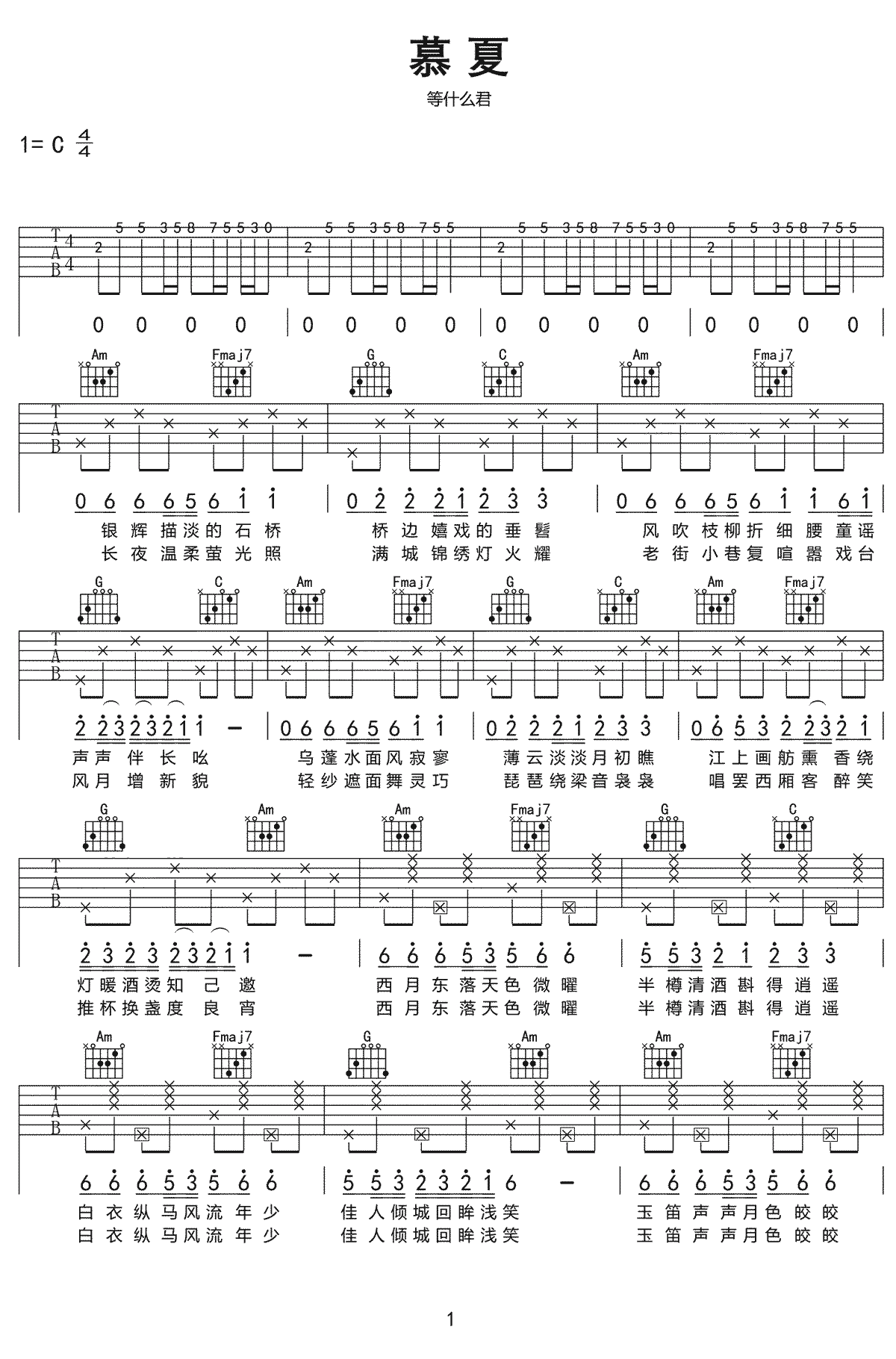 曲谱介绍: 等什么君《慕夏》吉他弹唱谱,采用C调指法编配,共有2张高清图谱,免翻页排版设计。