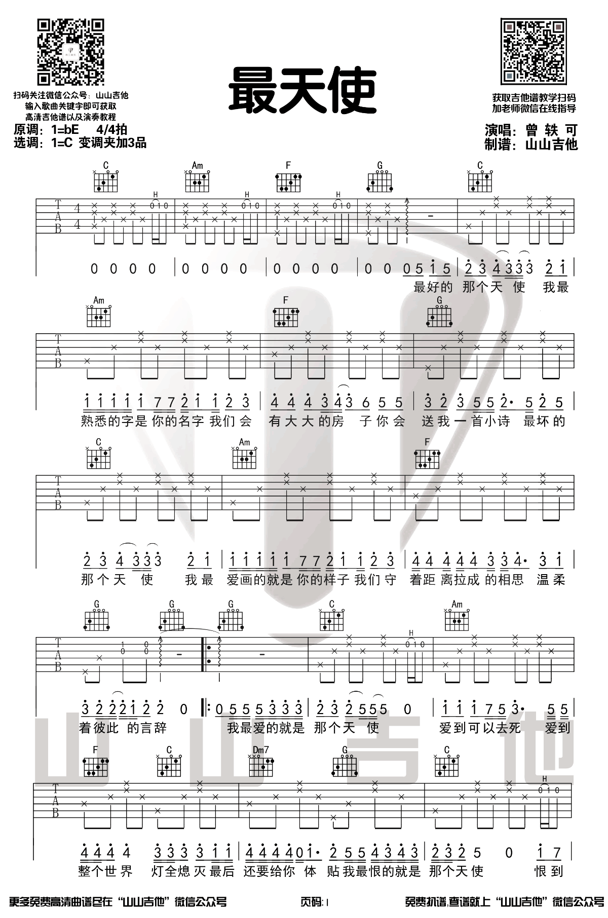 曲谱介绍: 曾轶可《最天使》吉他弹唱谱,采用C调指法编配原版,共有2张高清图谱,免翻页排版设计。