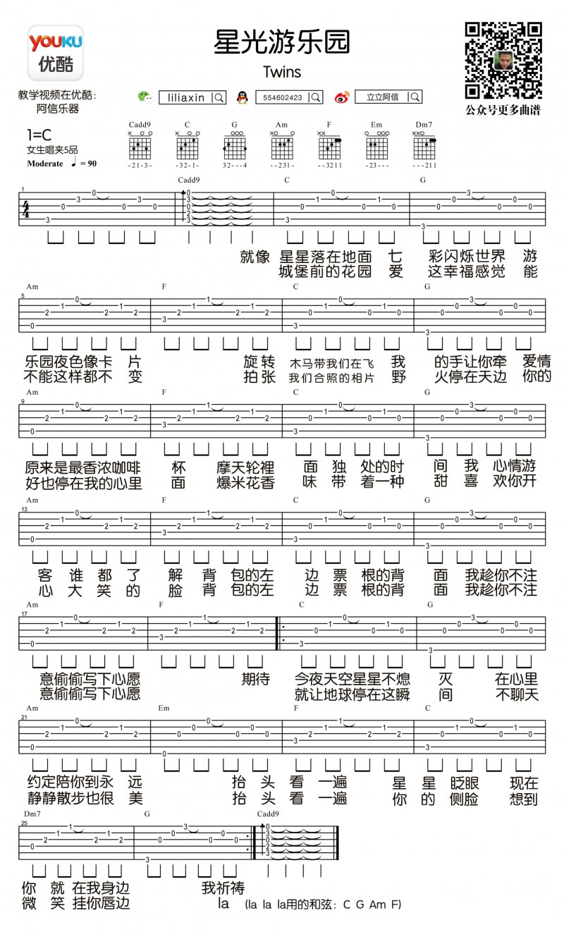 曲谱介绍: Twins《星光游乐园》吉他弹唱谱,采用C调指法编配原版,共有1张高清图谱,免翻页排版设计。