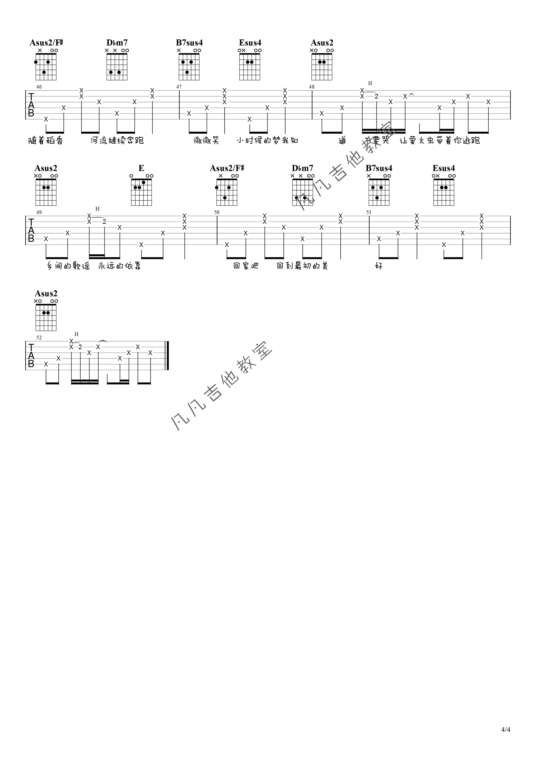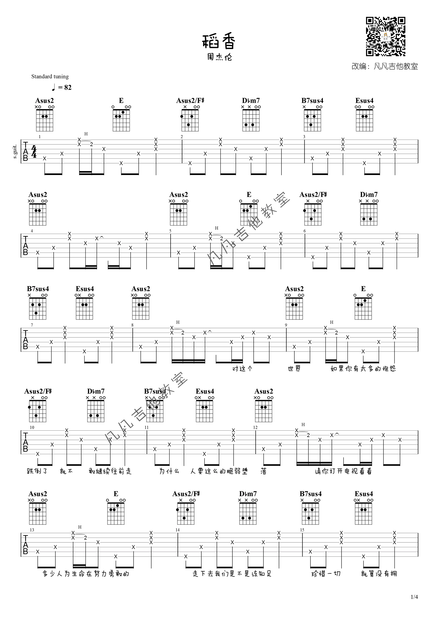 曲谱介绍: 周杰伦《稻香》吉他弹唱谱,采用A调指法编配原版,共有4张高清图谱。