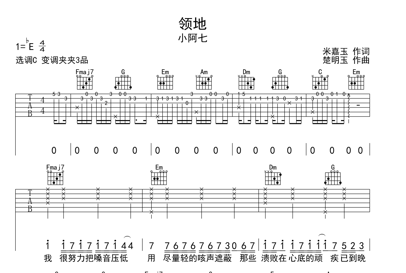 曲谱介绍: 小阿七《领地》吉他弹唱谱,采用C调指法编配,共有2张高清图谱,免翻页排版设计。