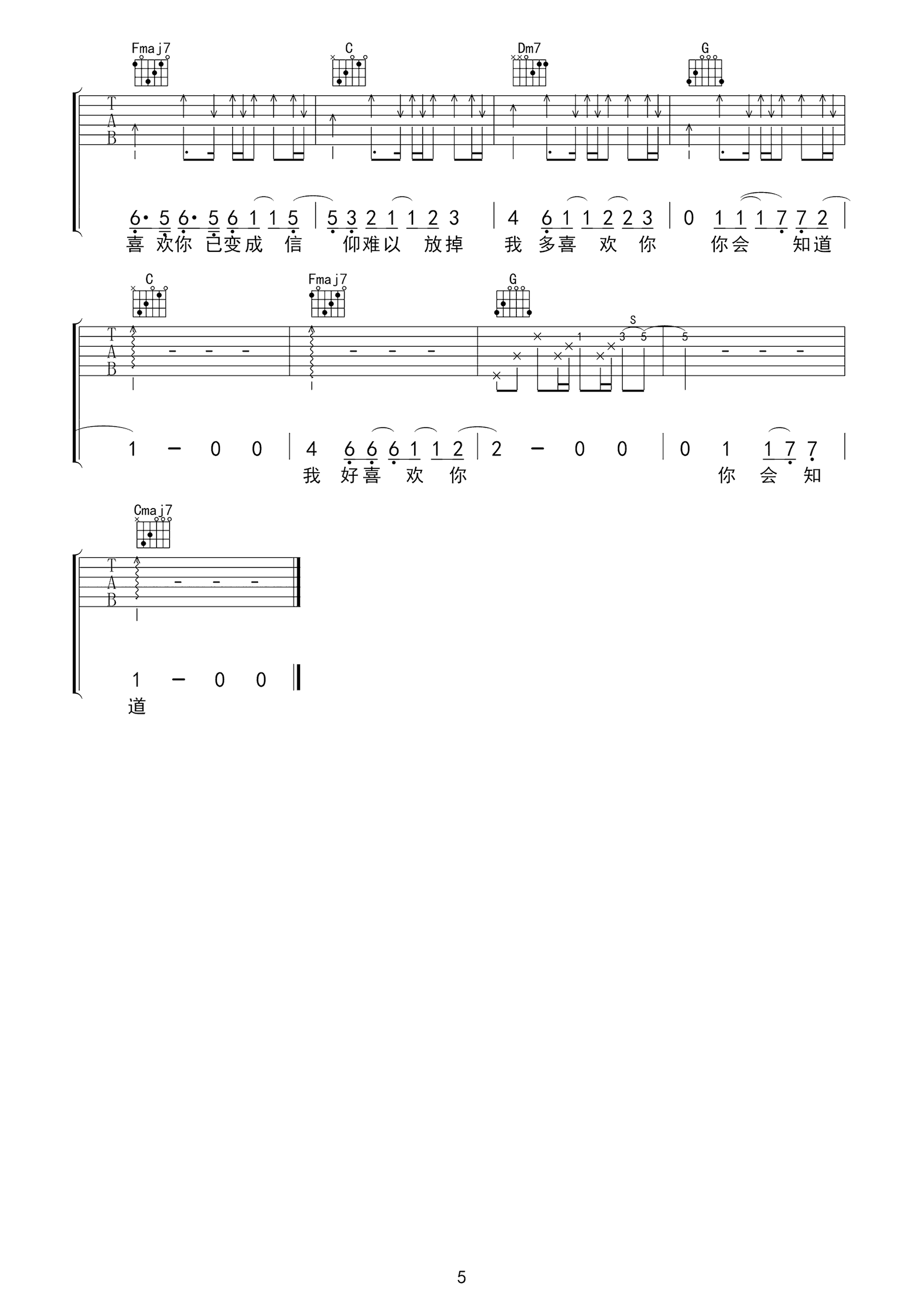 曲谱介绍: 王俊琪《我多喜欢你你会知道》吉他弹唱谱,采用C调指法编配,共有5张高清图谱。