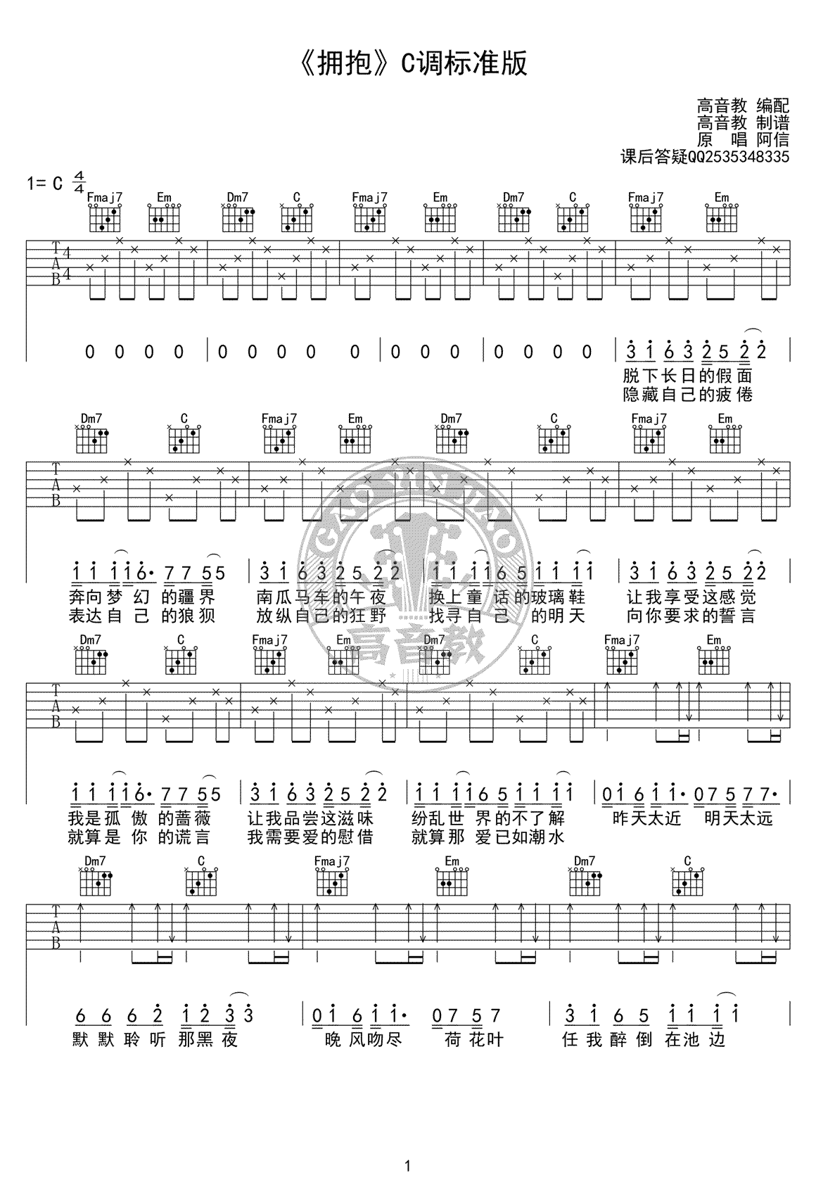 曲谱介绍: 五月天《拥抱》吉他弹唱谱,采用C调指法编配原版,共有2张高清图谱,免翻页排版设计。