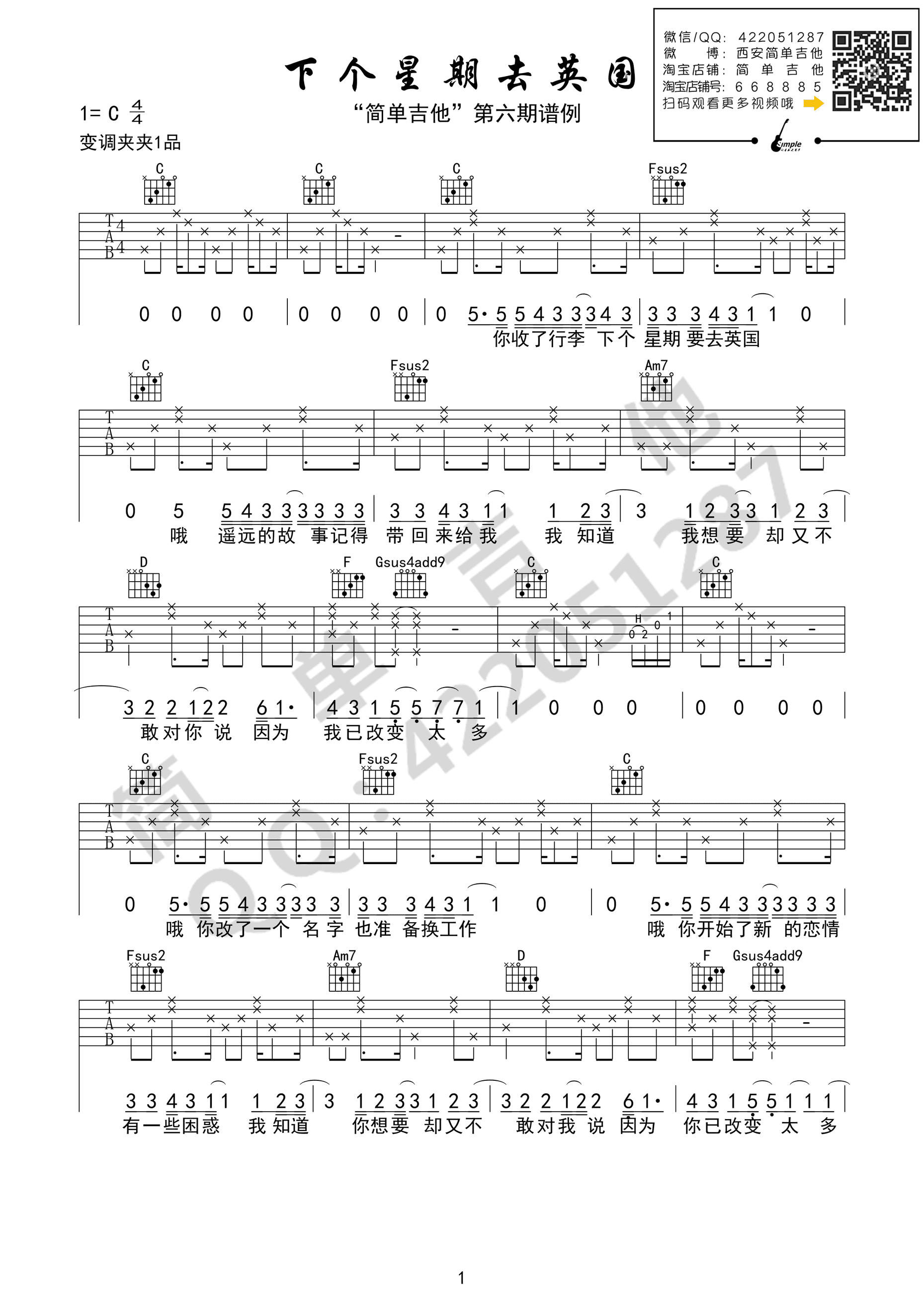曲谱介绍: 陈绮贞《下个星期去英国》吉他弹唱谱,采用C调指法编配,共有2张高清图谱,免翻页排版设计。