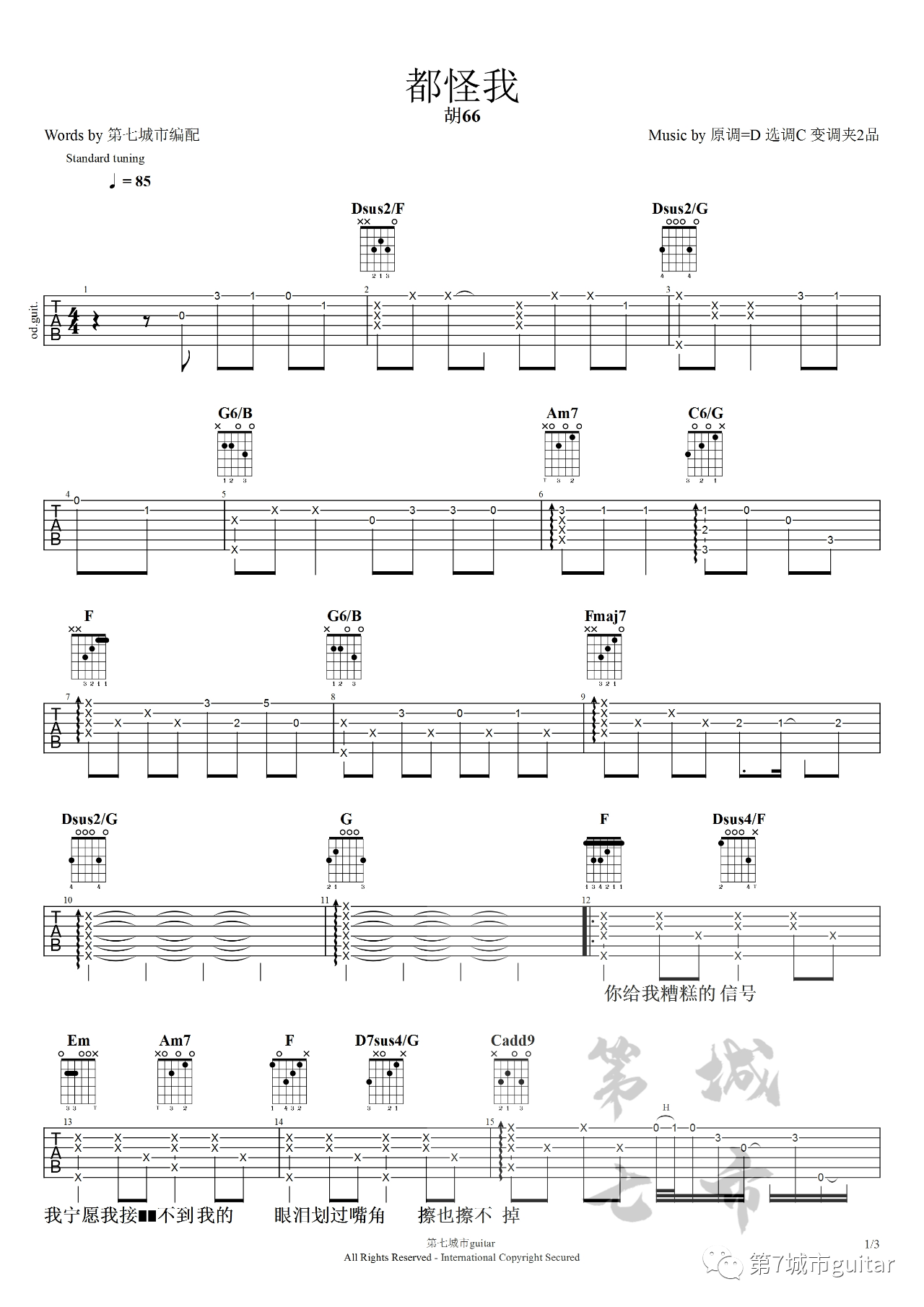 曲谱介绍: 胡66《都怪我》吉他弹唱谱,采用C调指法编配原版,共有3张高清图谱。