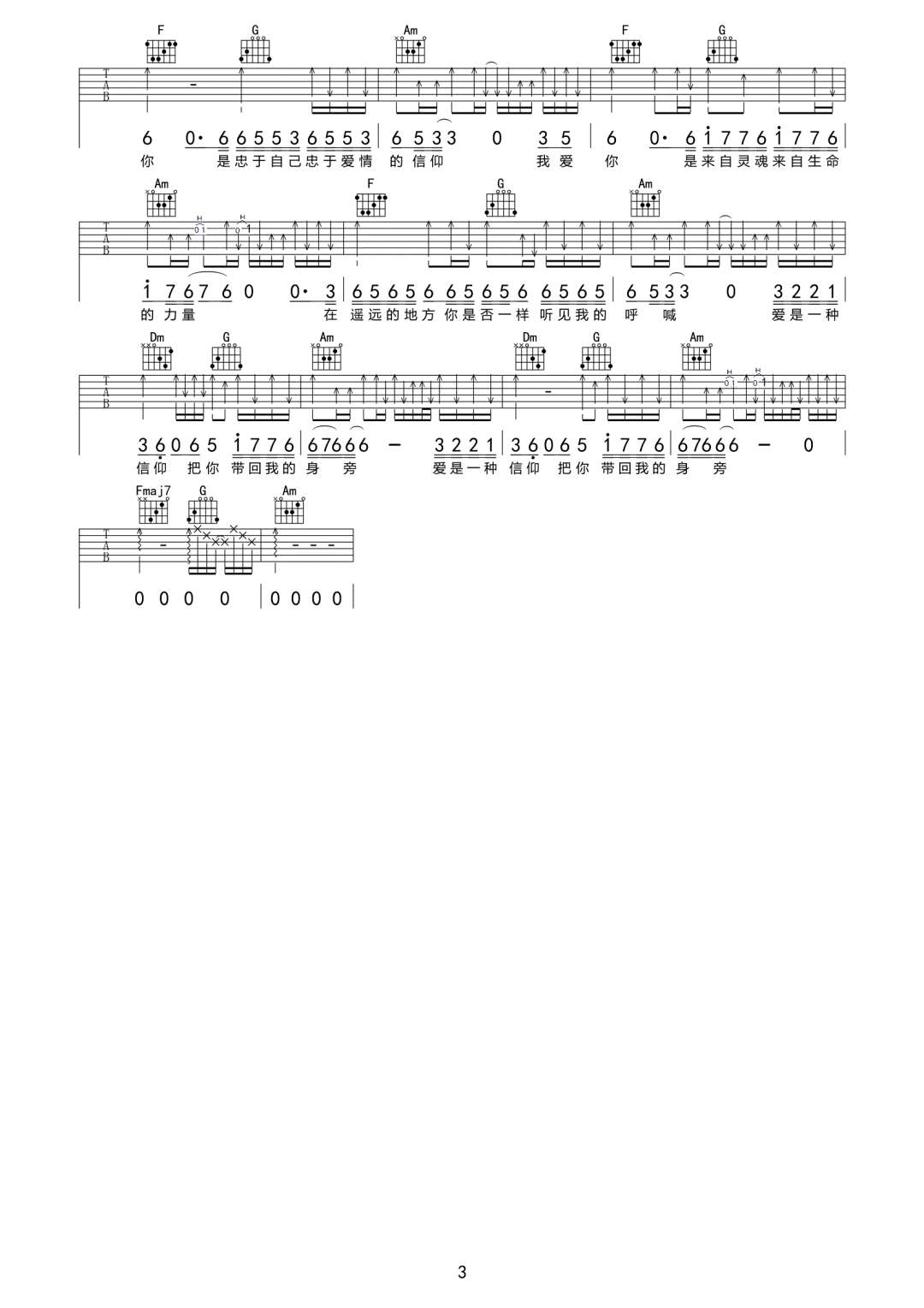 曲谱介绍: 刘大壮《信仰》吉他弹唱谱,采用C调指法编配原版,共有3张高清图谱。