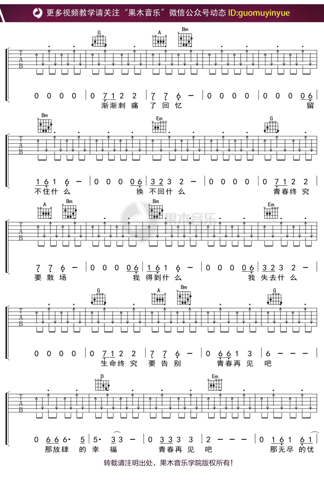曲谱介绍: 水木年华《青春再见》吉他弹唱谱,采用D调指法编配,共有4张高清图谱。