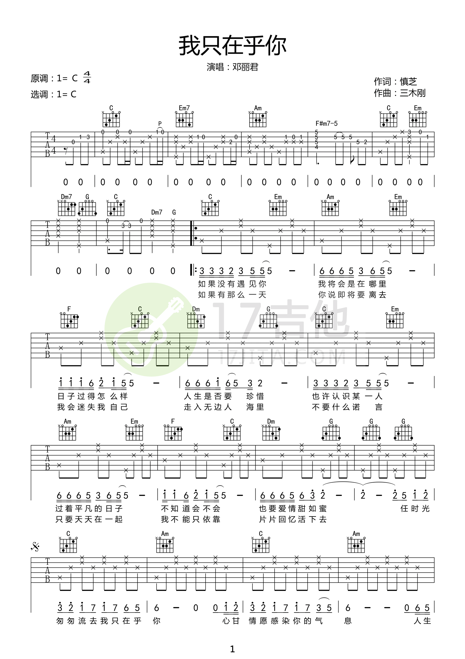 我只在乎你吉他谱 - 邓丽君 - C调吉他弹唱谱 - 原版