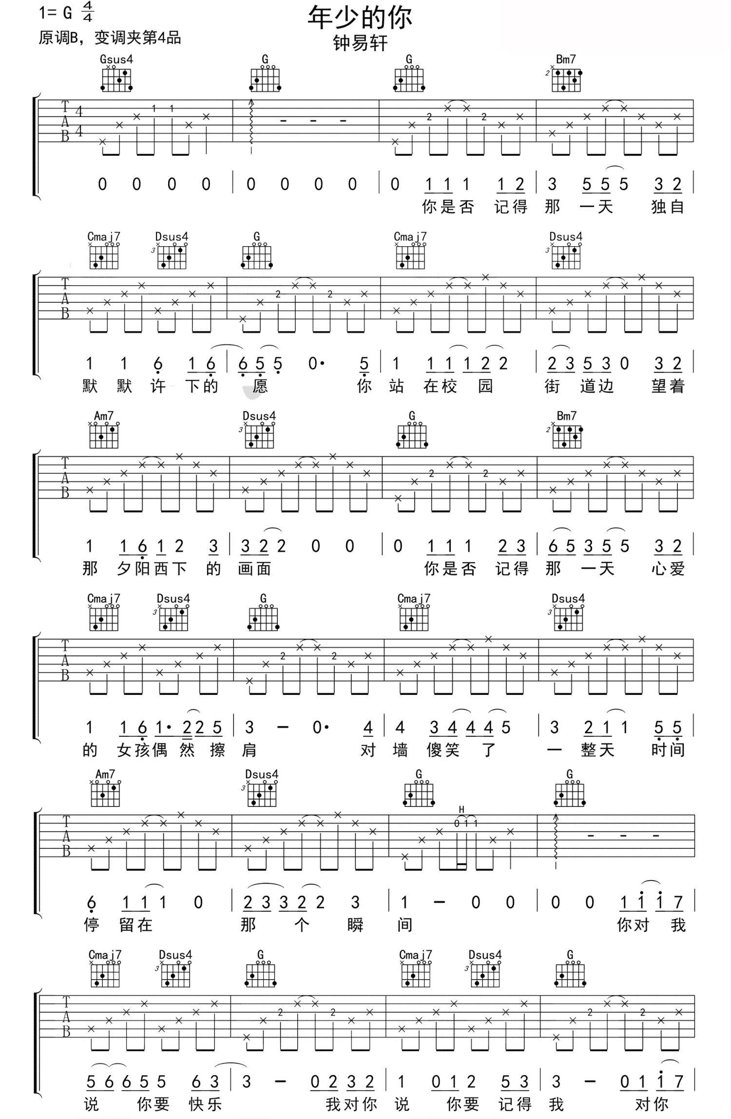 年少的你吉他谱 - 钟易轩 - G调吉他弹唱谱