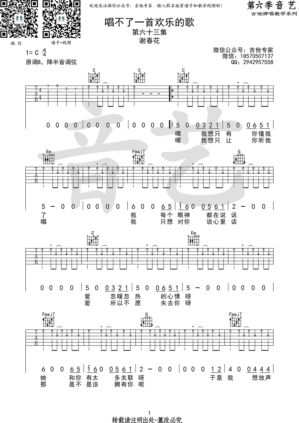 唱不了一首欢乐的歌吉他谱 - 谢春花 - C调吉他弹唱谱