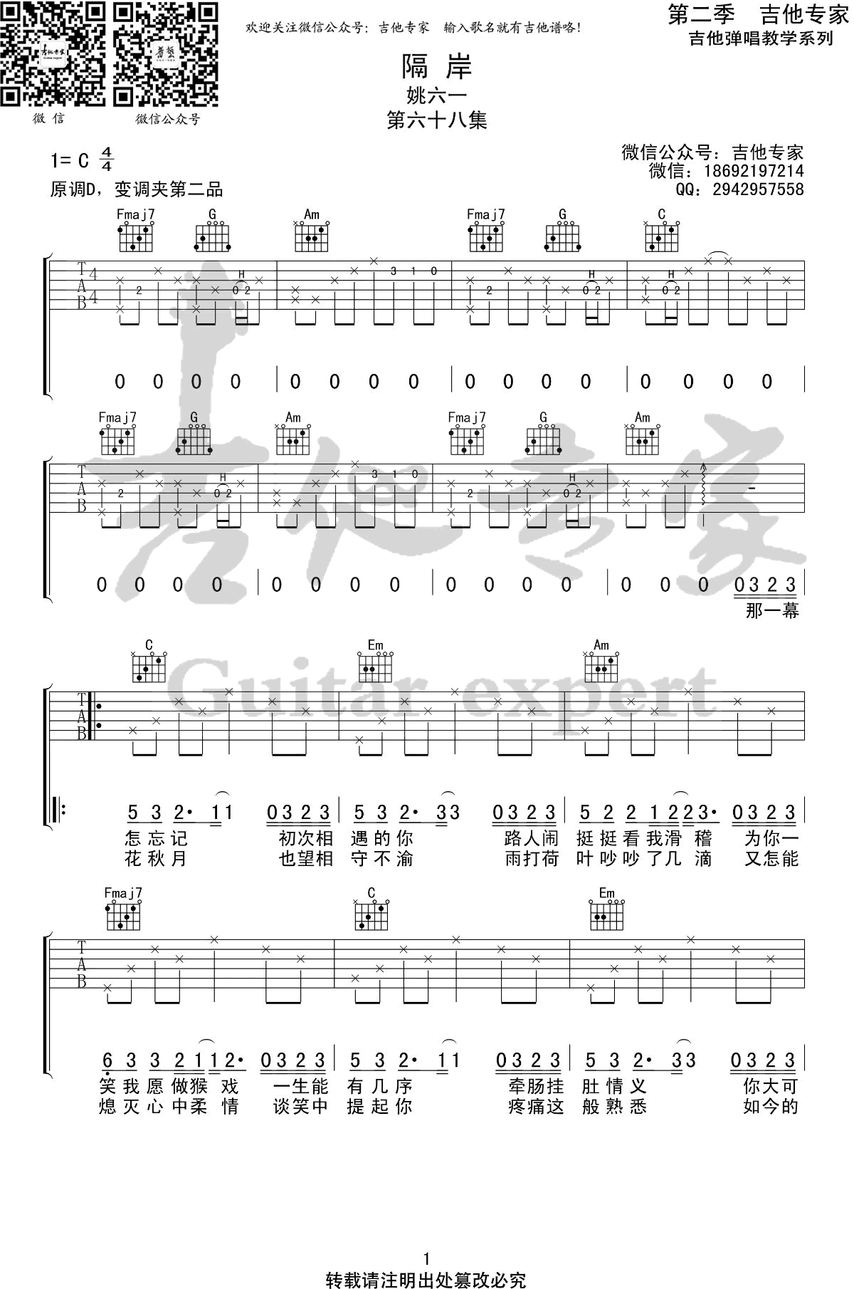 曲谱介绍: 姚六一《隔岸》吉他弹唱谱,采用C调指法编配,共有3张高清图谱。