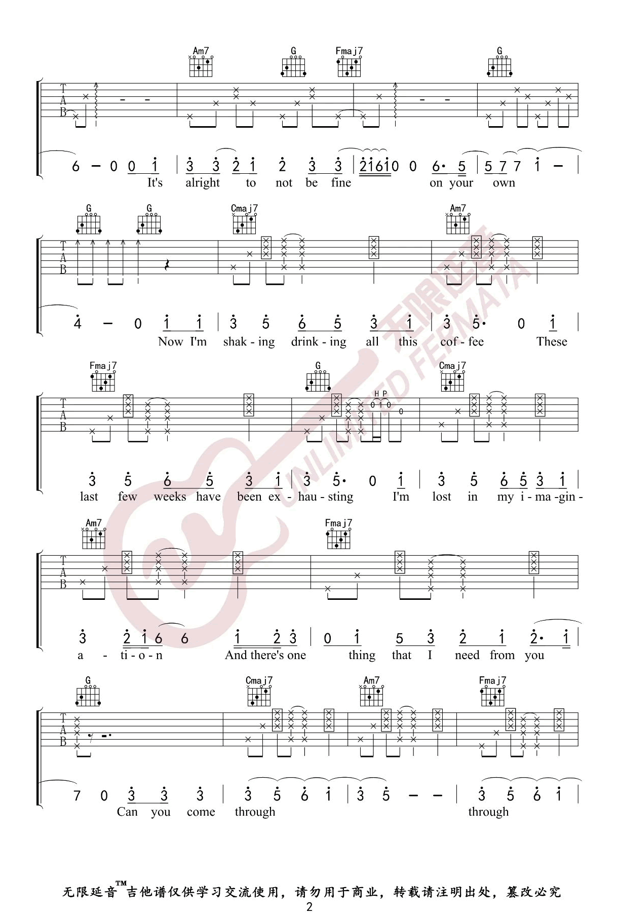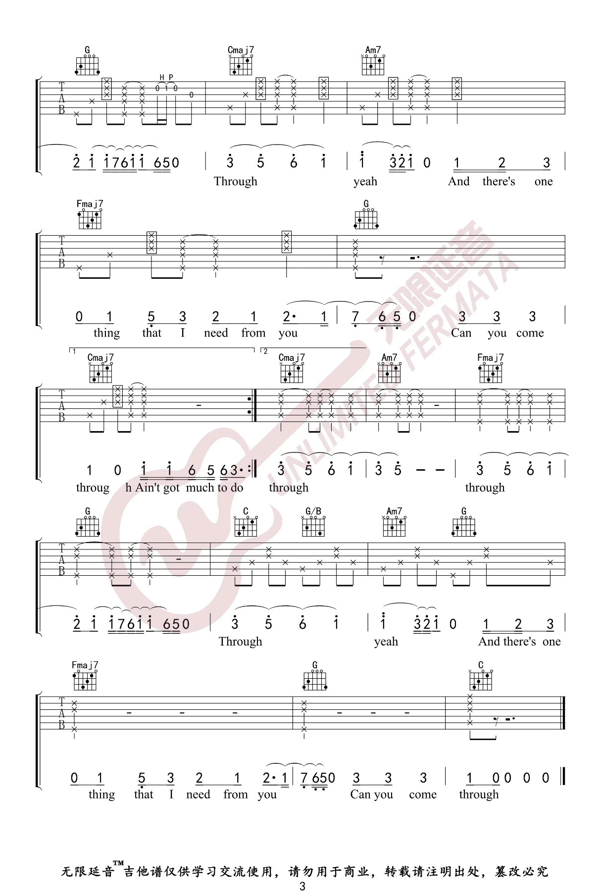 曲谱介绍: Jeremy《Comethru》吉他弹唱谱,采用C调指法编配,共有3张高清图谱。