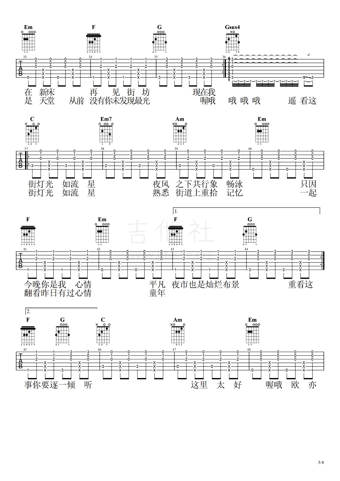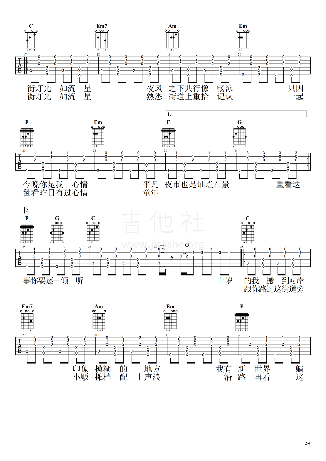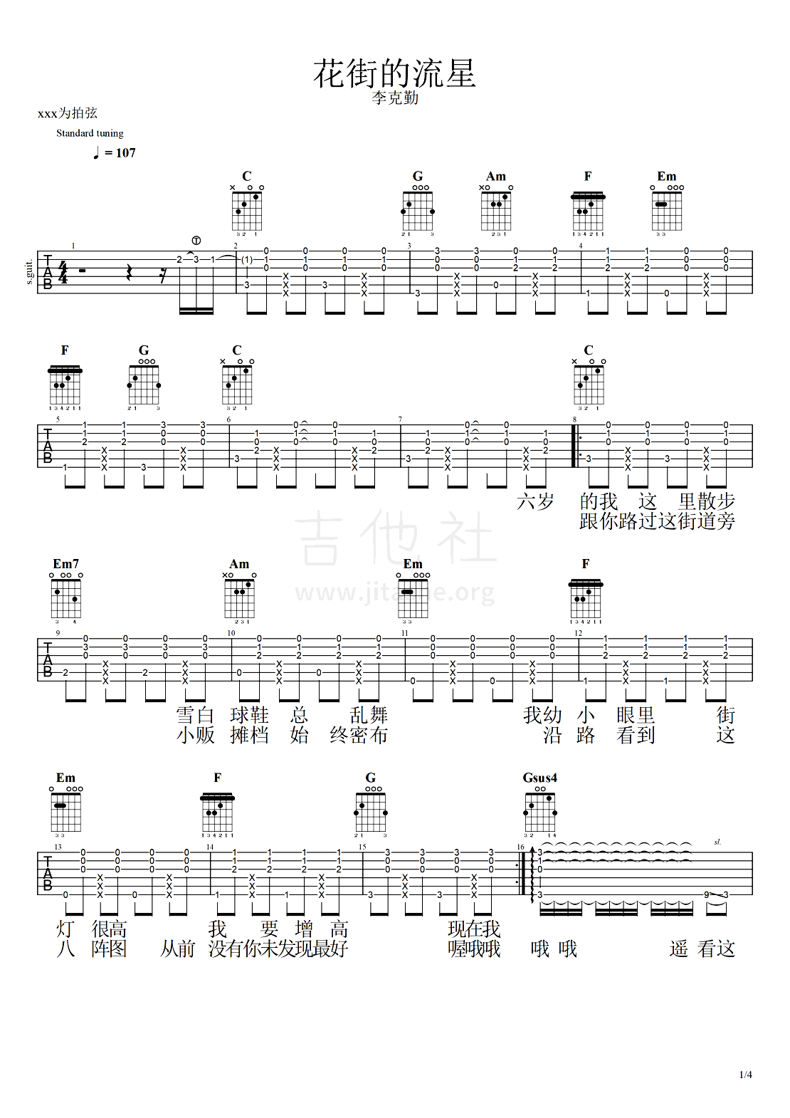 曲谱介绍: 李克勤《花街的流星》吉他弹唱谱,采用C调指法编配,共有4张高清图谱。