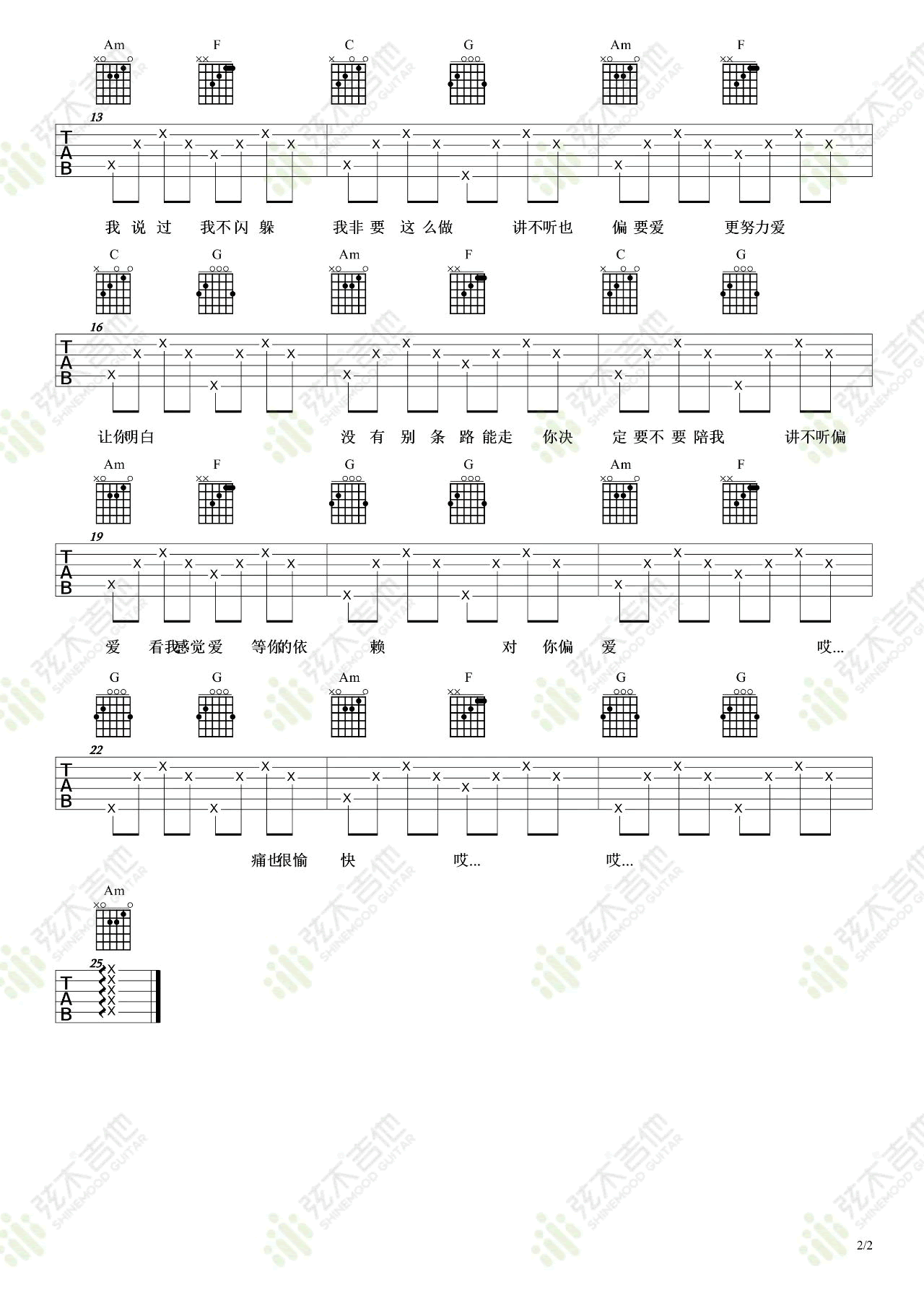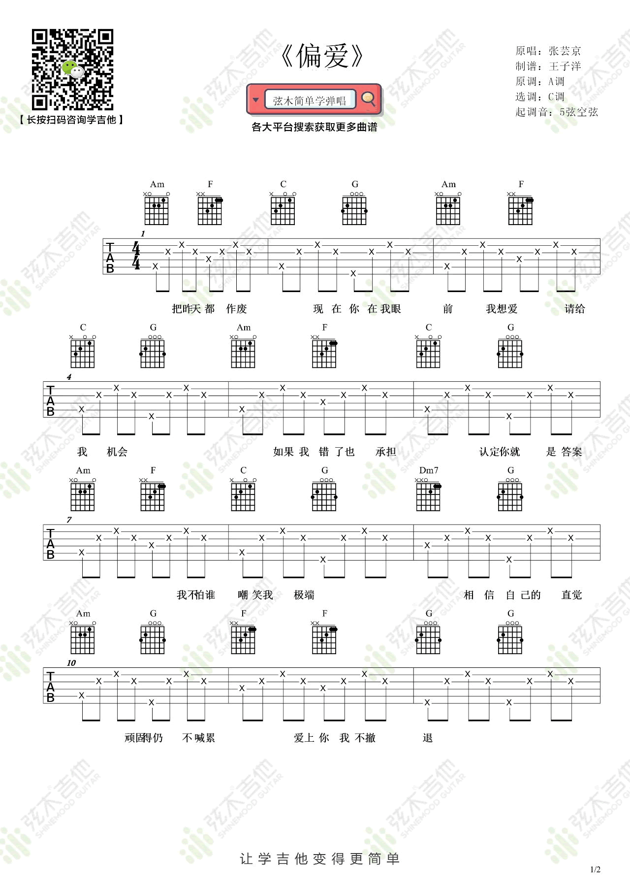 曲谱介绍: 张芸京《偏爱》吉他弹唱谱,采用C调指法编配,共有2张高清图谱,免翻页排版设计。
