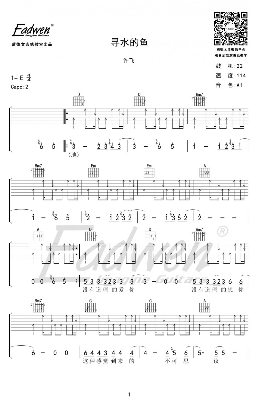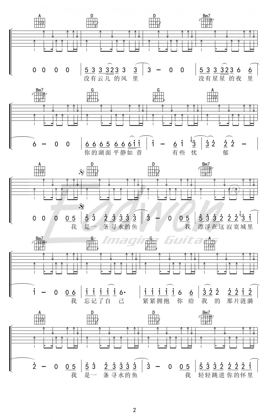曲谱介绍: 许飞《寻水的鱼》吉他弹唱谱,采用D调指法编配,共有3张高清图谱。