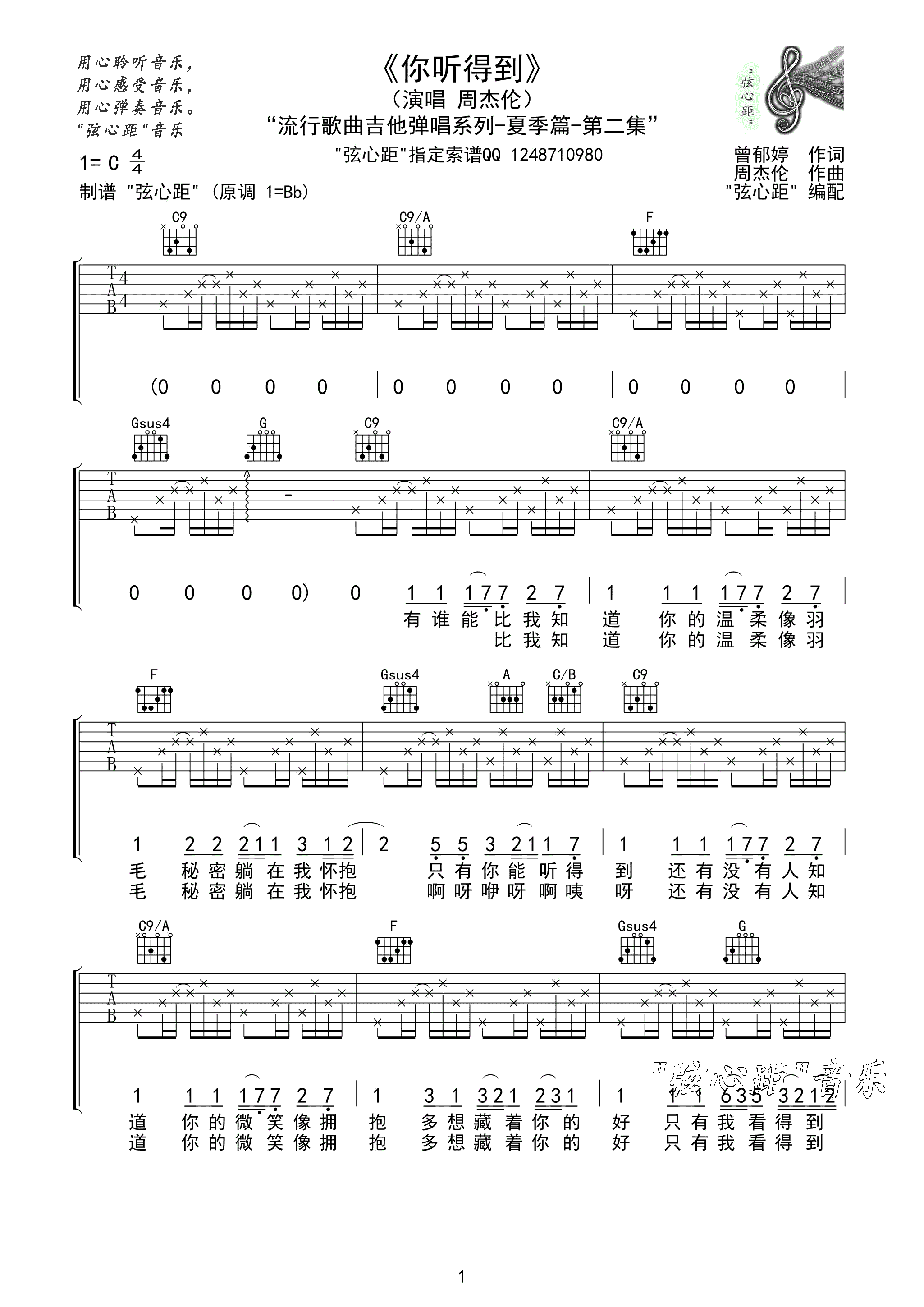 曲谱介绍: 周杰伦《你听得到》吉他弹唱谱,采用C调指法编配,共有3张高清图谱。