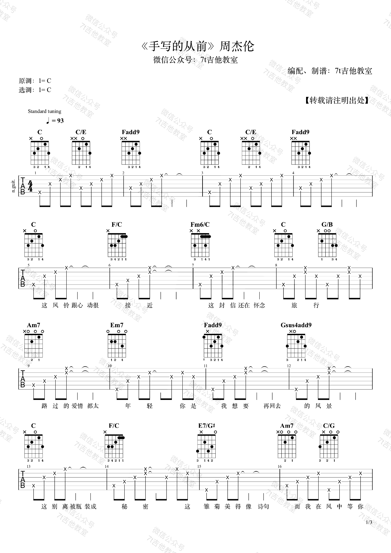 曲谱介绍: 周杰伦《手写的从前》吉他弹唱谱,采用C调指法编配,共有3张高清图谱。