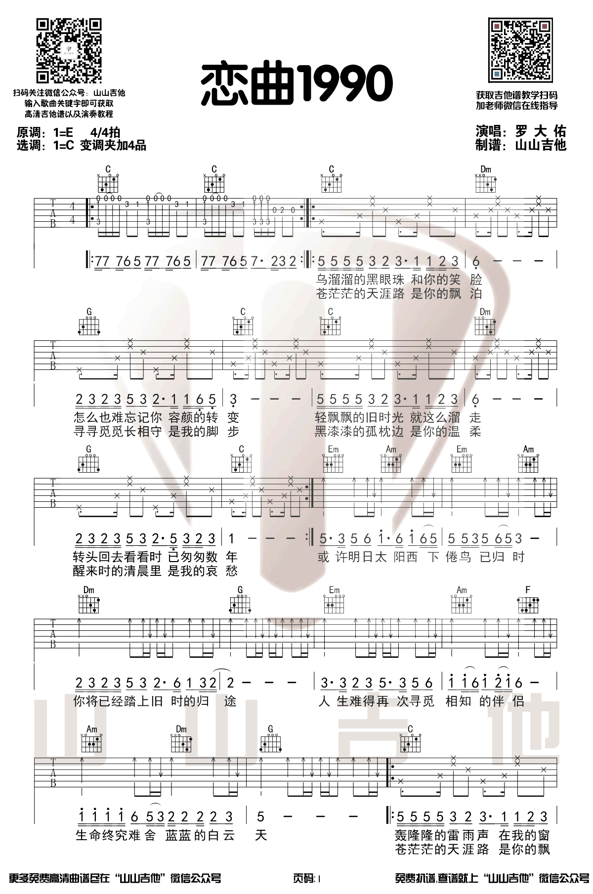 曲谱介绍: 罗大佑《恋曲1990》吉他弹唱谱,采用C调指法编配原版,共有3张高清图谱。