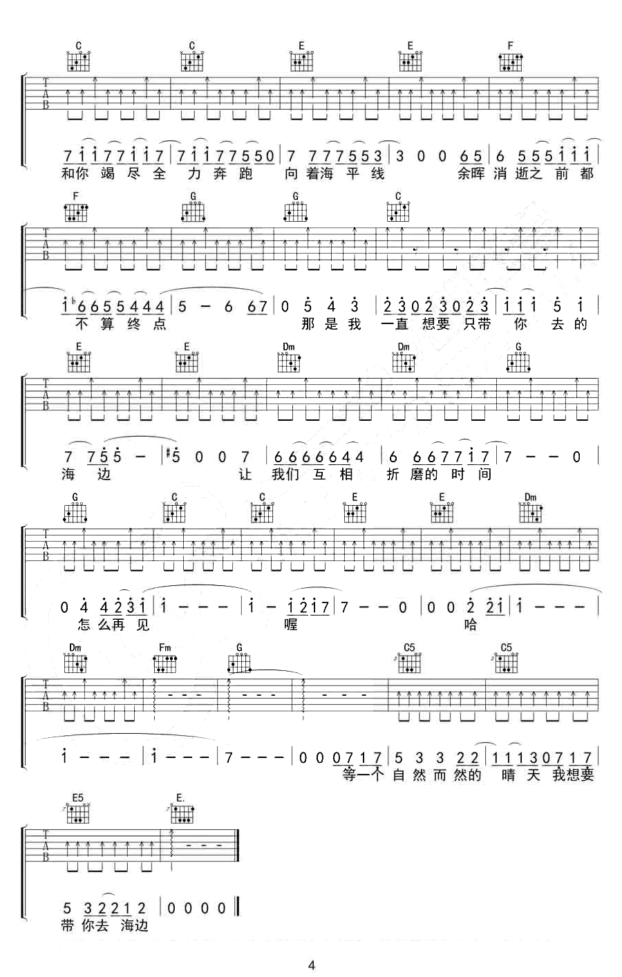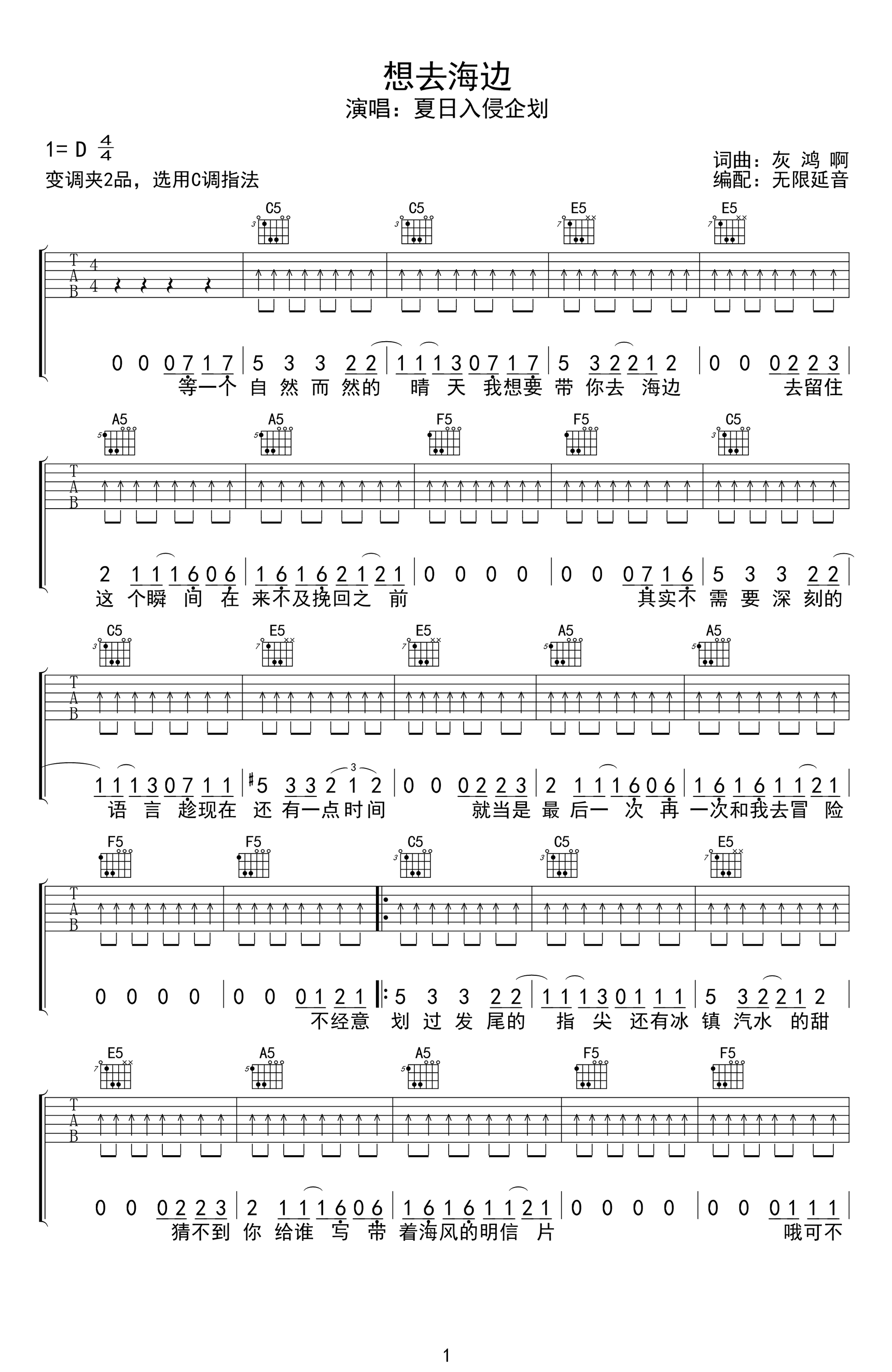曲谱介绍: 《想去海边》吉他弹唱谱,原调D,变调夹夹第二品,选用C调指法,共四张图片六线谱。让我们在歌声中一起向着海边出发,去拥抱自由的快乐吧。