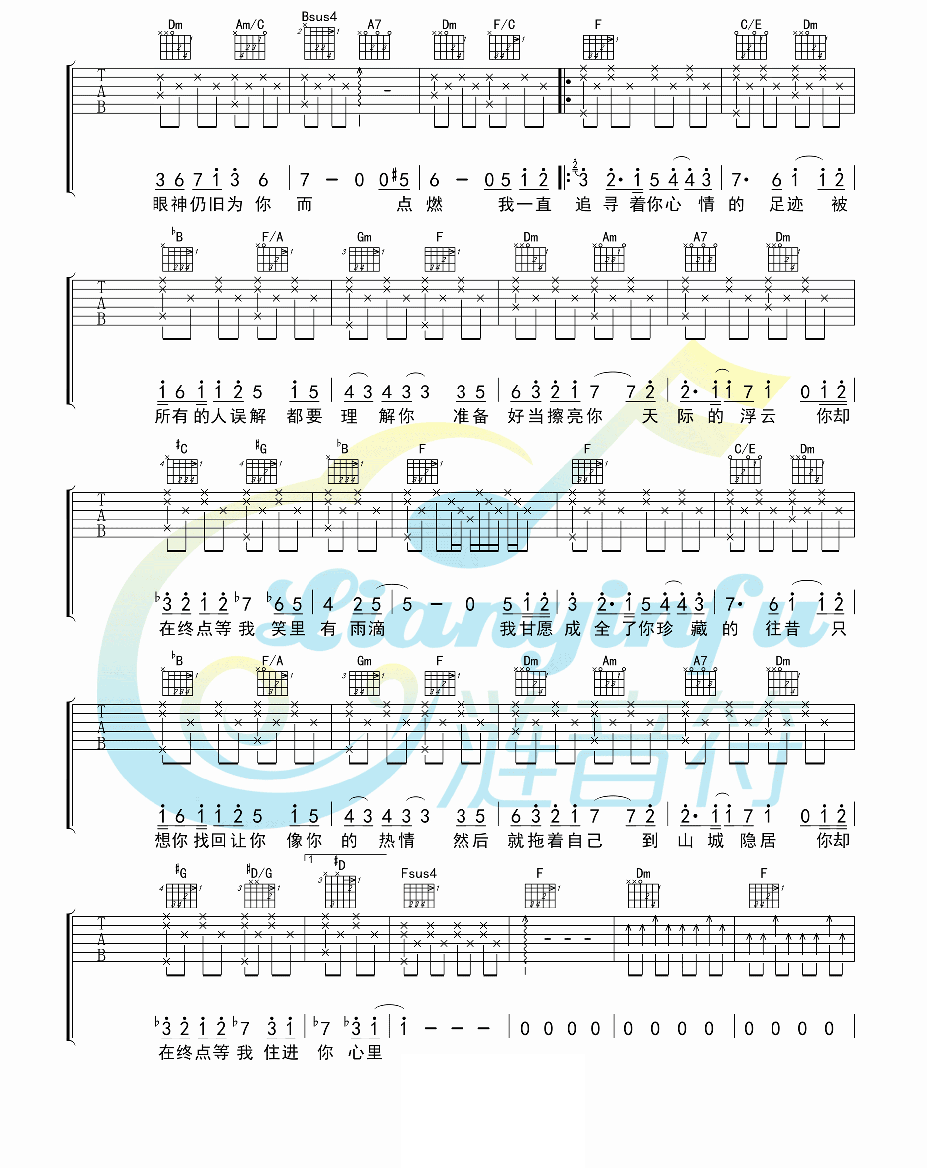 曲谱介绍: 王菲《你在终点等我》吉他弹唱谱,采用F调指法编配,共有3张高清图谱。