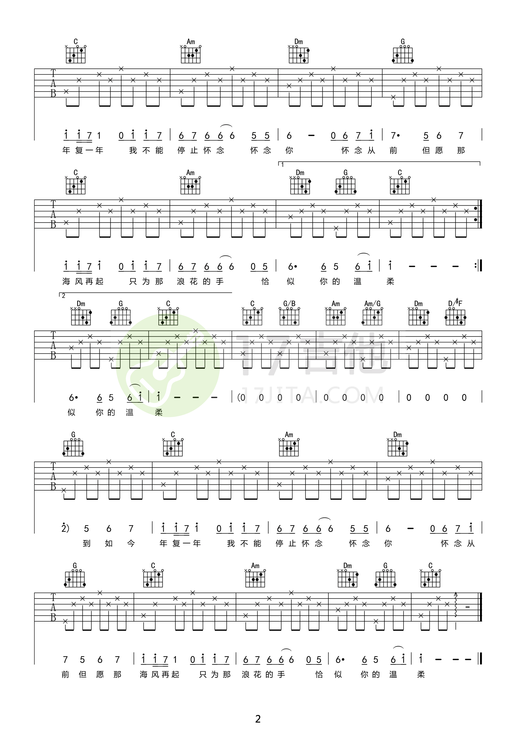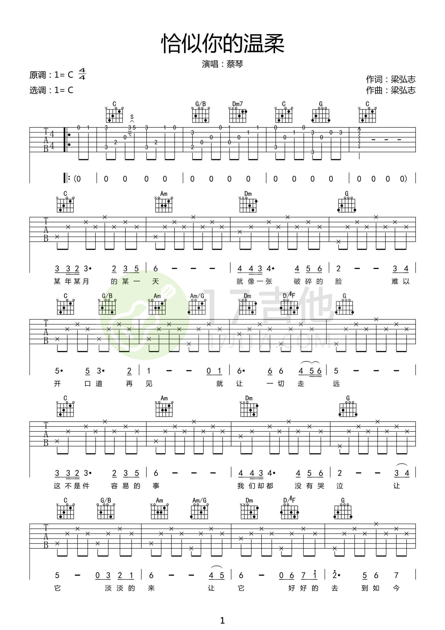 曲谱介绍: 蔡琴《恰似你的温柔》吉他弹唱谱,采用C调指法编配原版,共有2张高清图谱,免翻页排版设计。