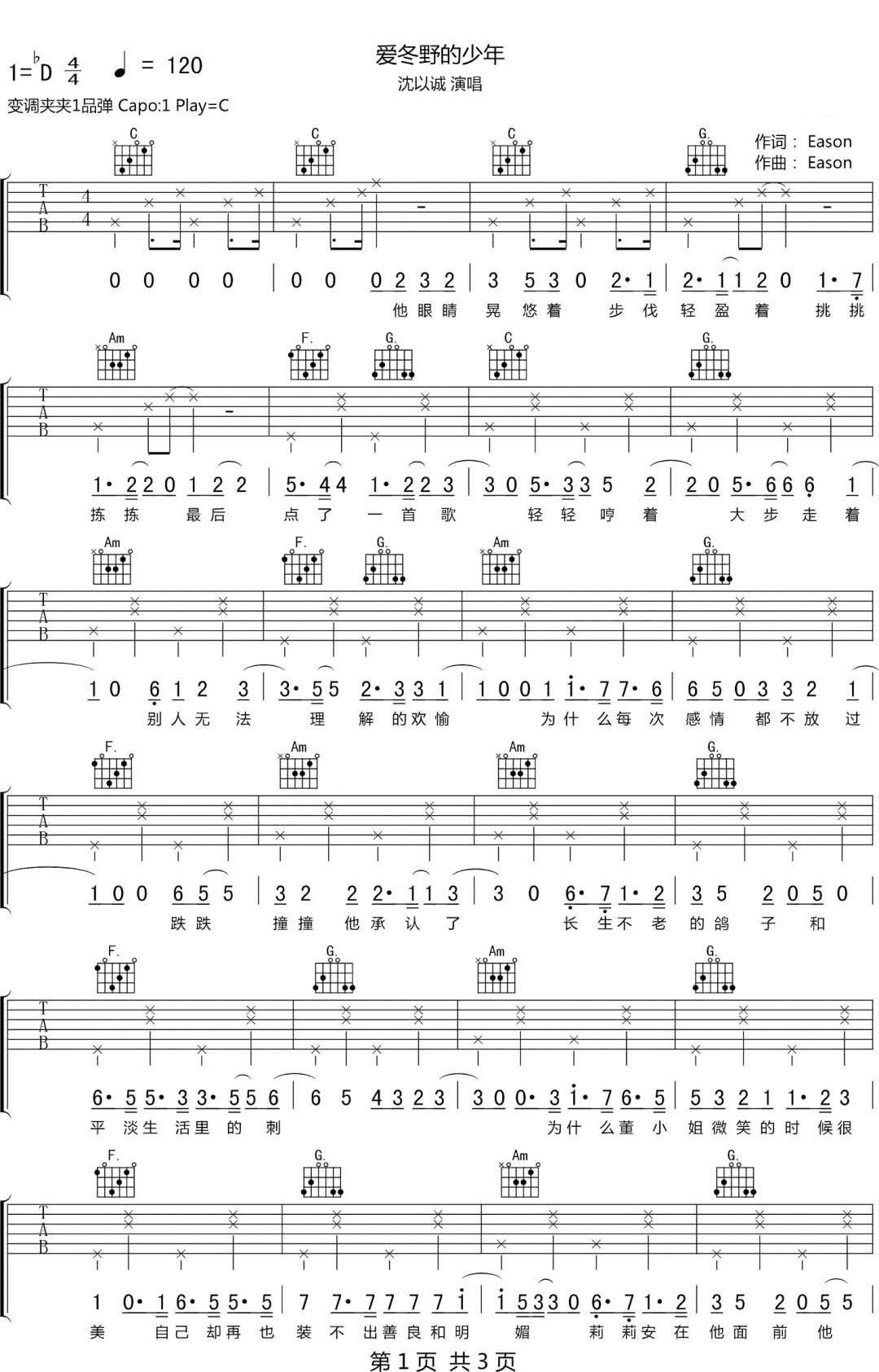 曲谱介绍: 沈以诚《爱冬野的少年》吉他弹唱谱,采用C调指法编配,共有3张高清图谱。