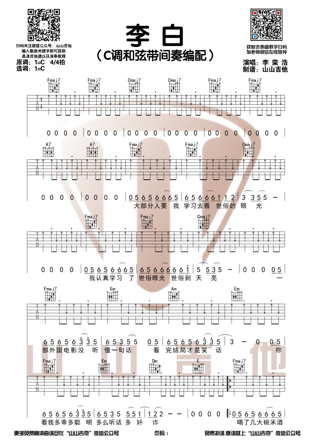 曲谱介绍: 李荣浩《李白》吉他弹唱谱,采用C调指法编配原版,共有3张高清图谱。