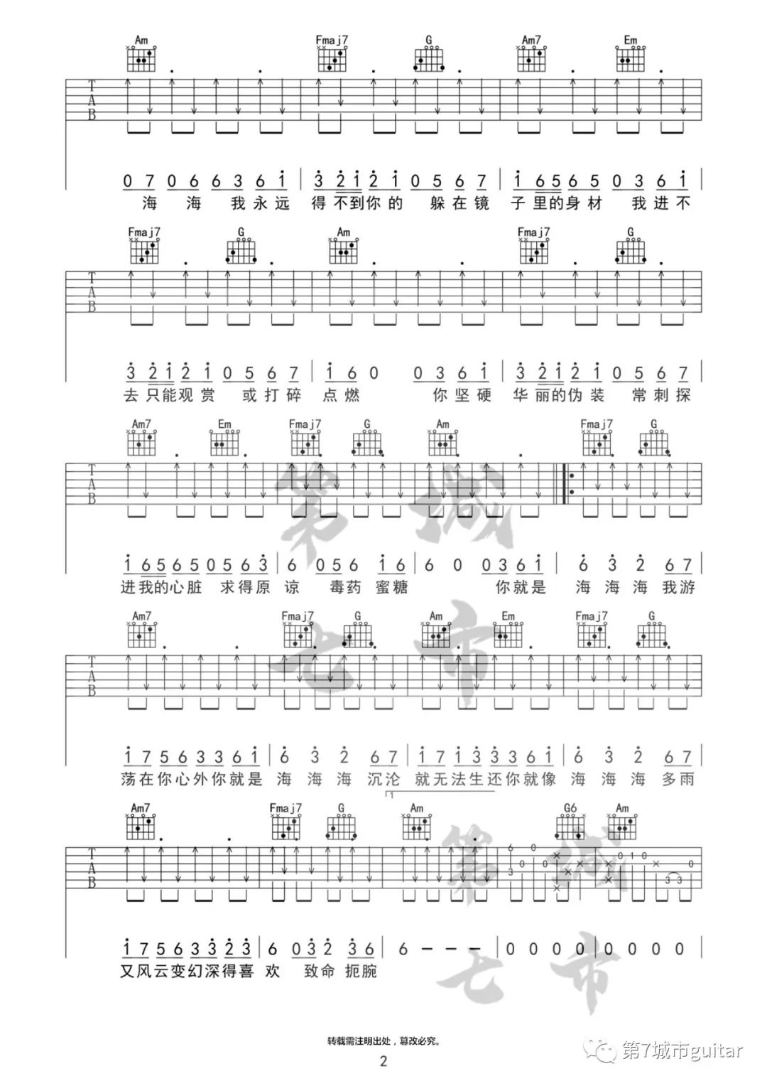 曲谱介绍: 阿悄《海海海》吉他弹唱谱,采用C调指法编配原版,共有3张高清图谱。