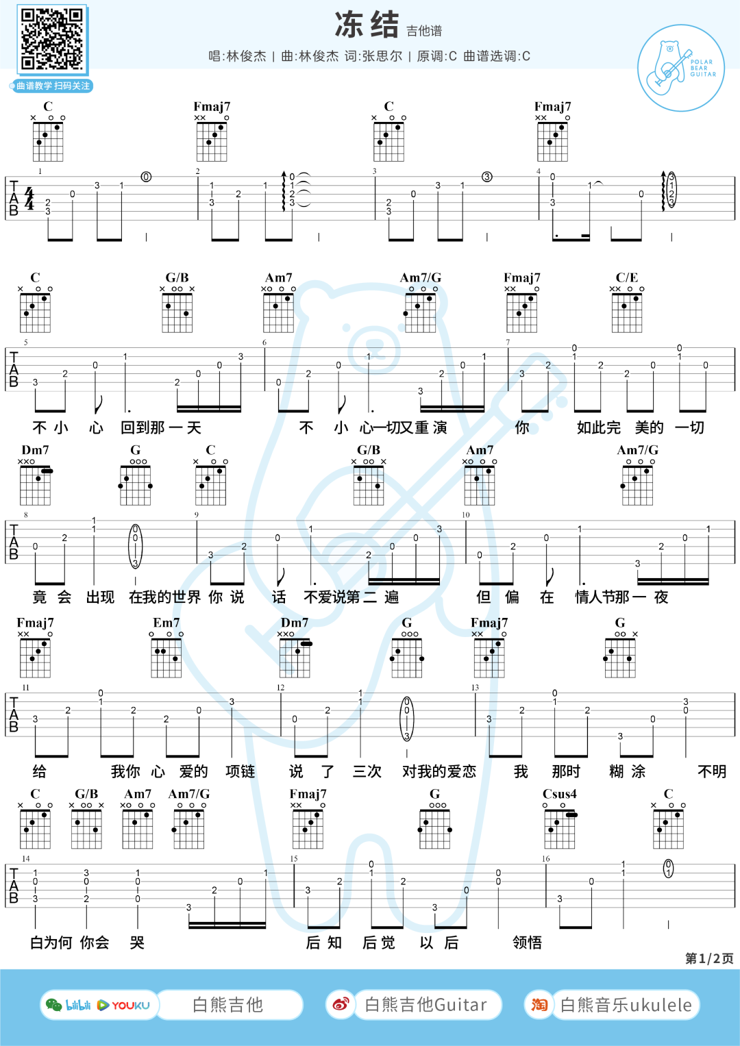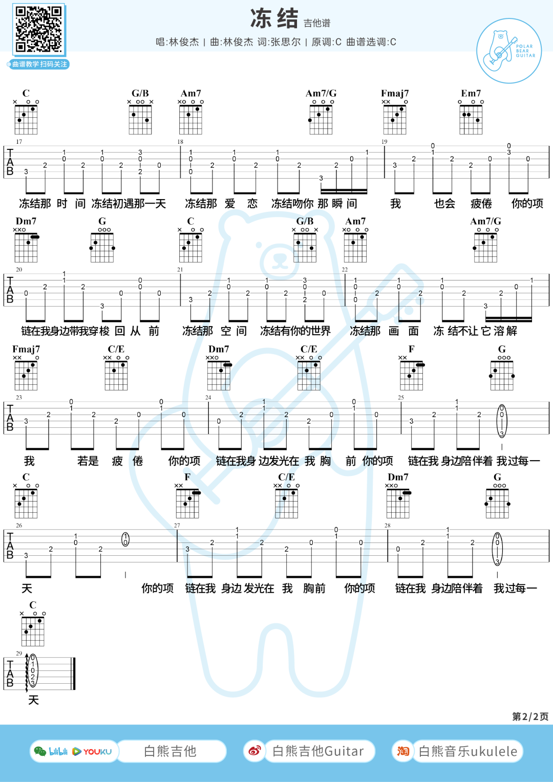 曲谱介绍: 林俊杰《冻结》吉他弹唱谱,采用C调指法编配原版,共有3张高清图谱。