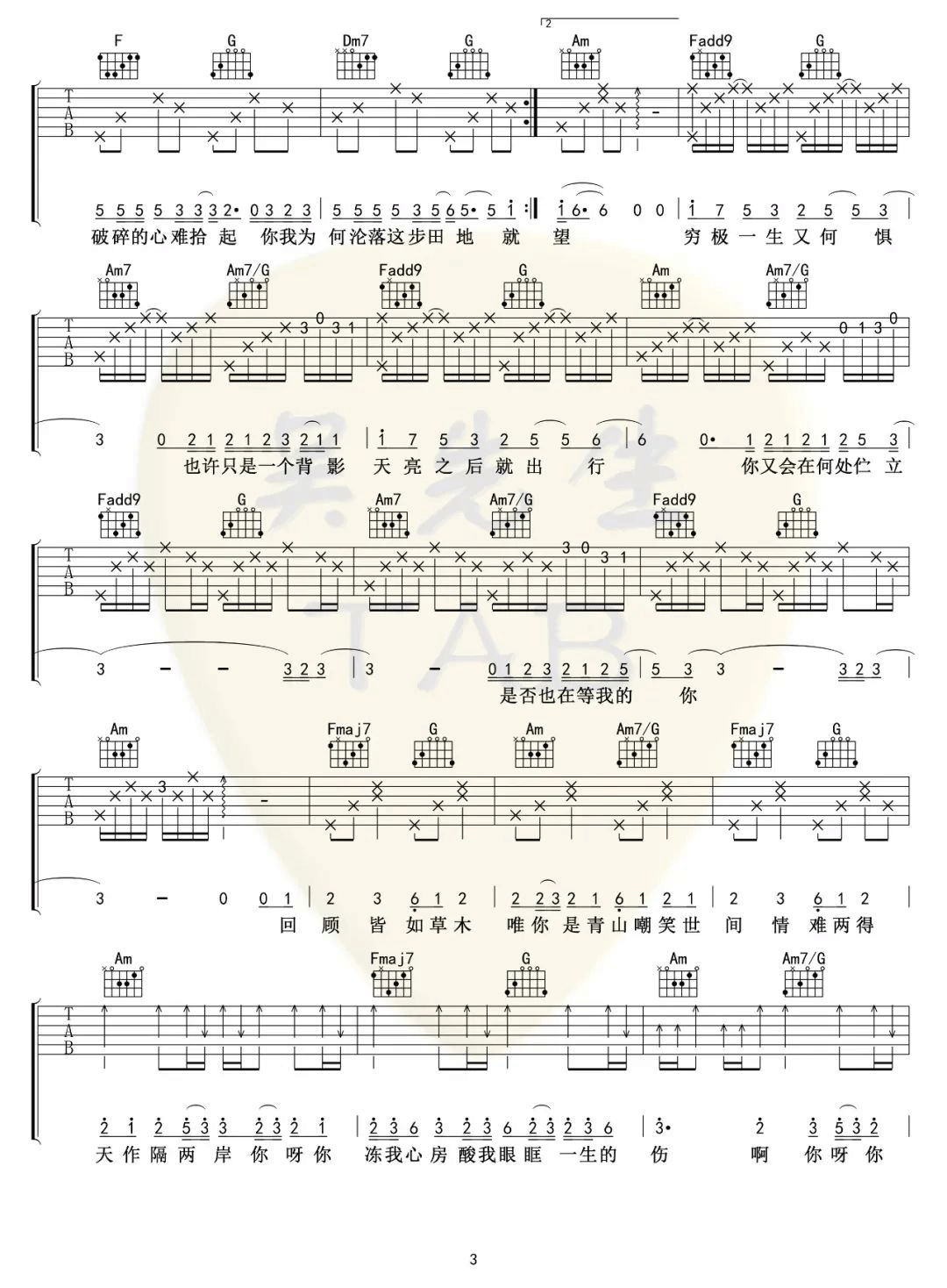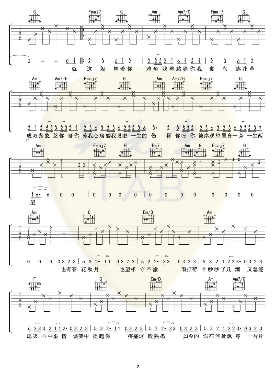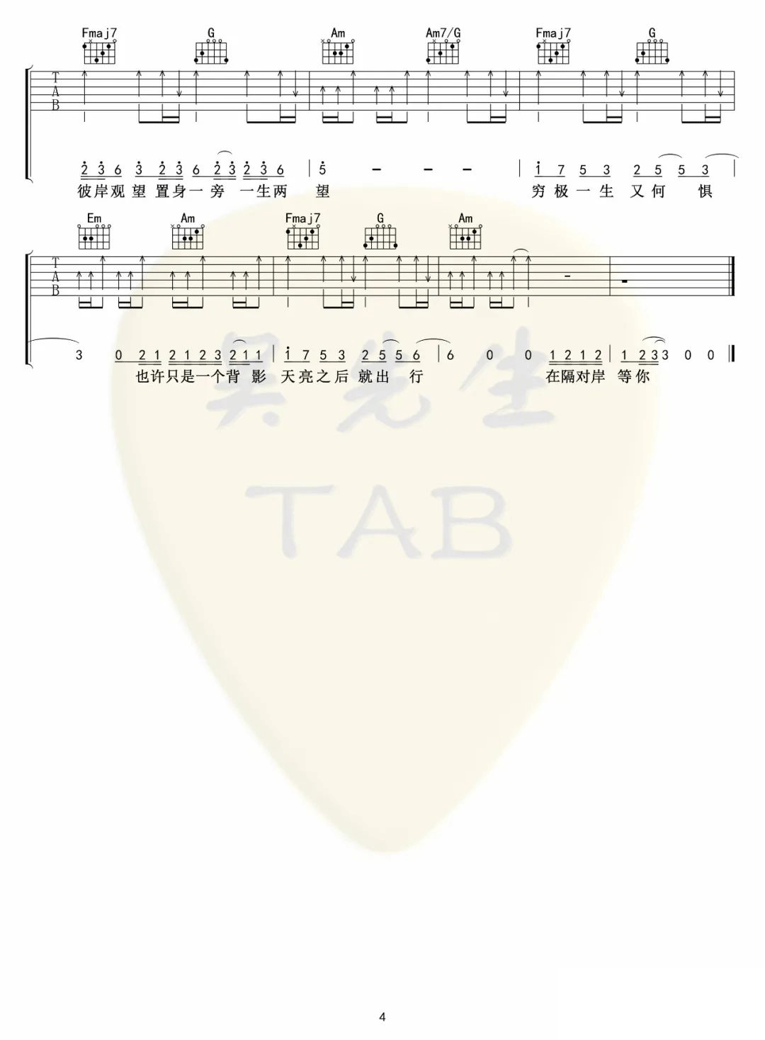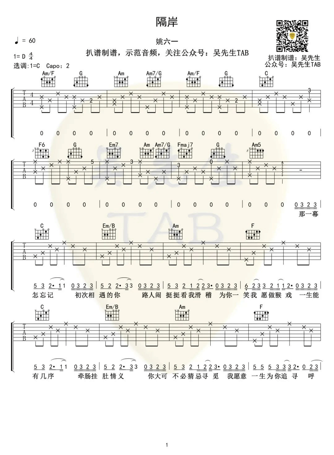 曲谱介绍: ​《隔岸》吉他弹唱谱,采用C调指法编配原版,共有4张高清图谱。