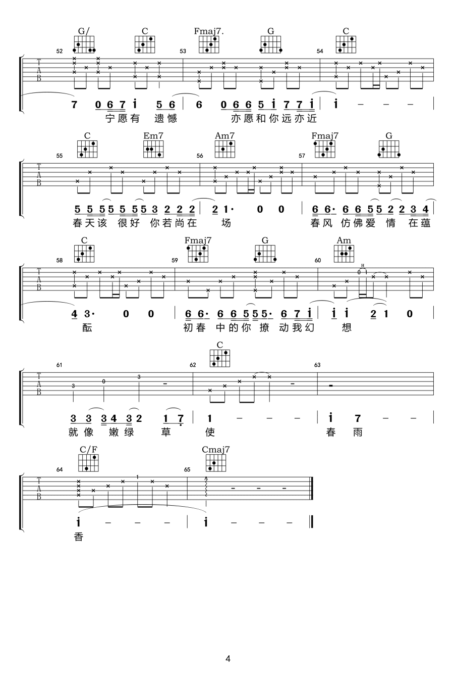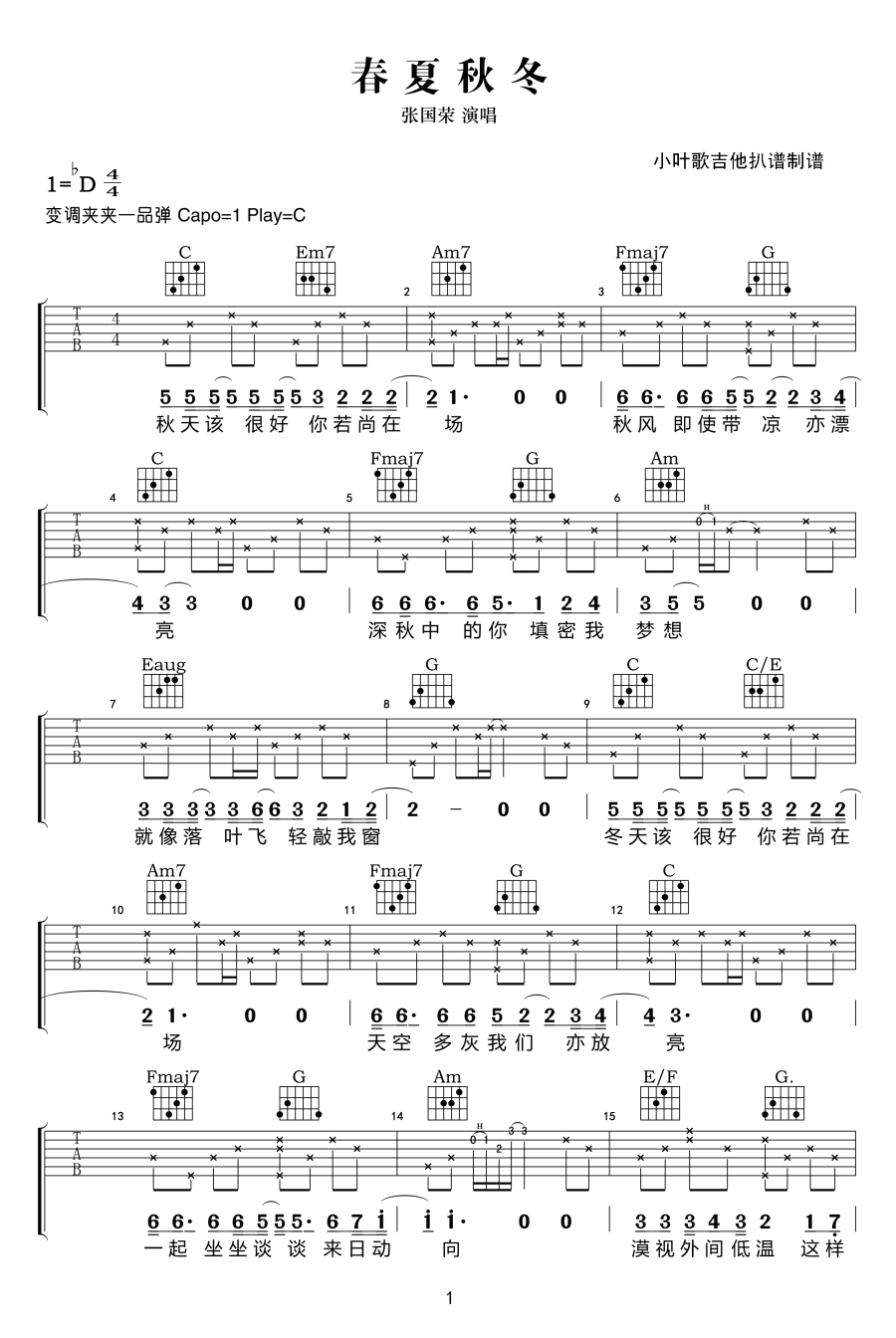 曲谱介绍: 《春夏秋冬》吉他弹唱谱,原调bD,变调夹夹一品弹,选用C调指法,完整版编配共四张图片六线谱。