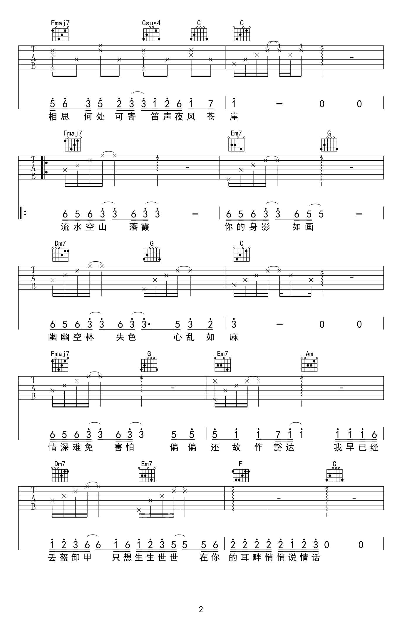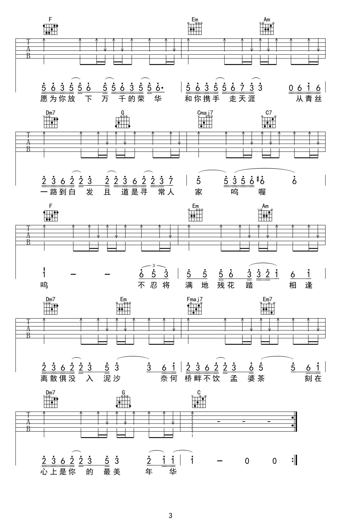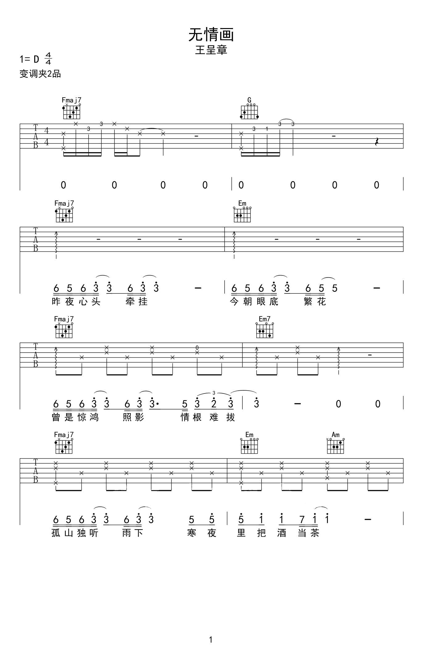 曲谱介绍: 王呈章《无情画》吉他弹唱谱,采用C调指法编配,共有3张高清图谱。