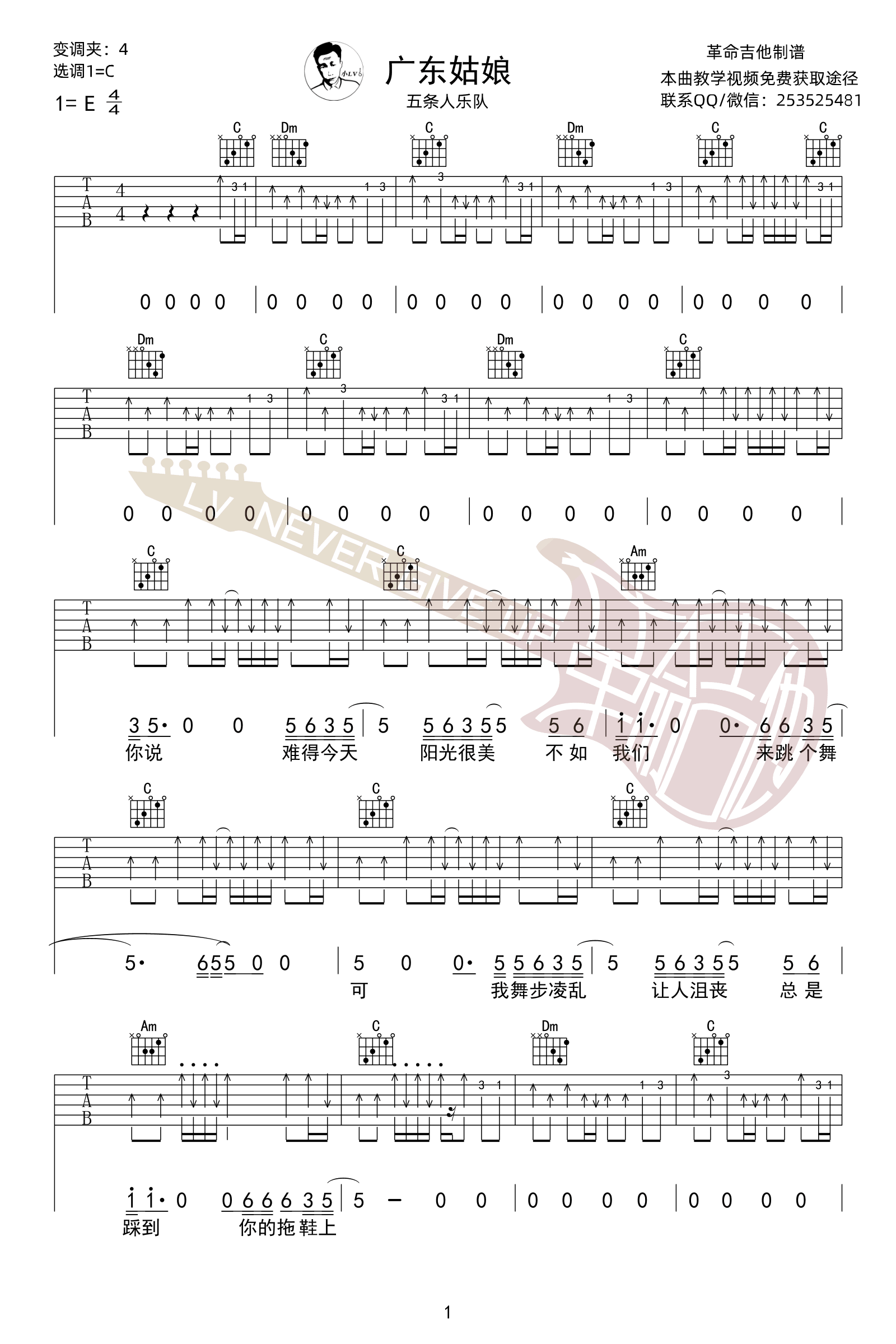曲谱介绍: 五条人《广东姑娘》吉他弹唱谱,采用C调指法编配,共有4张高清图谱。