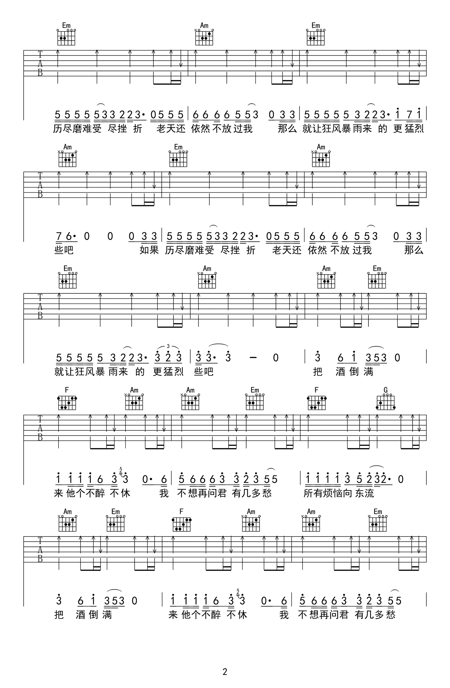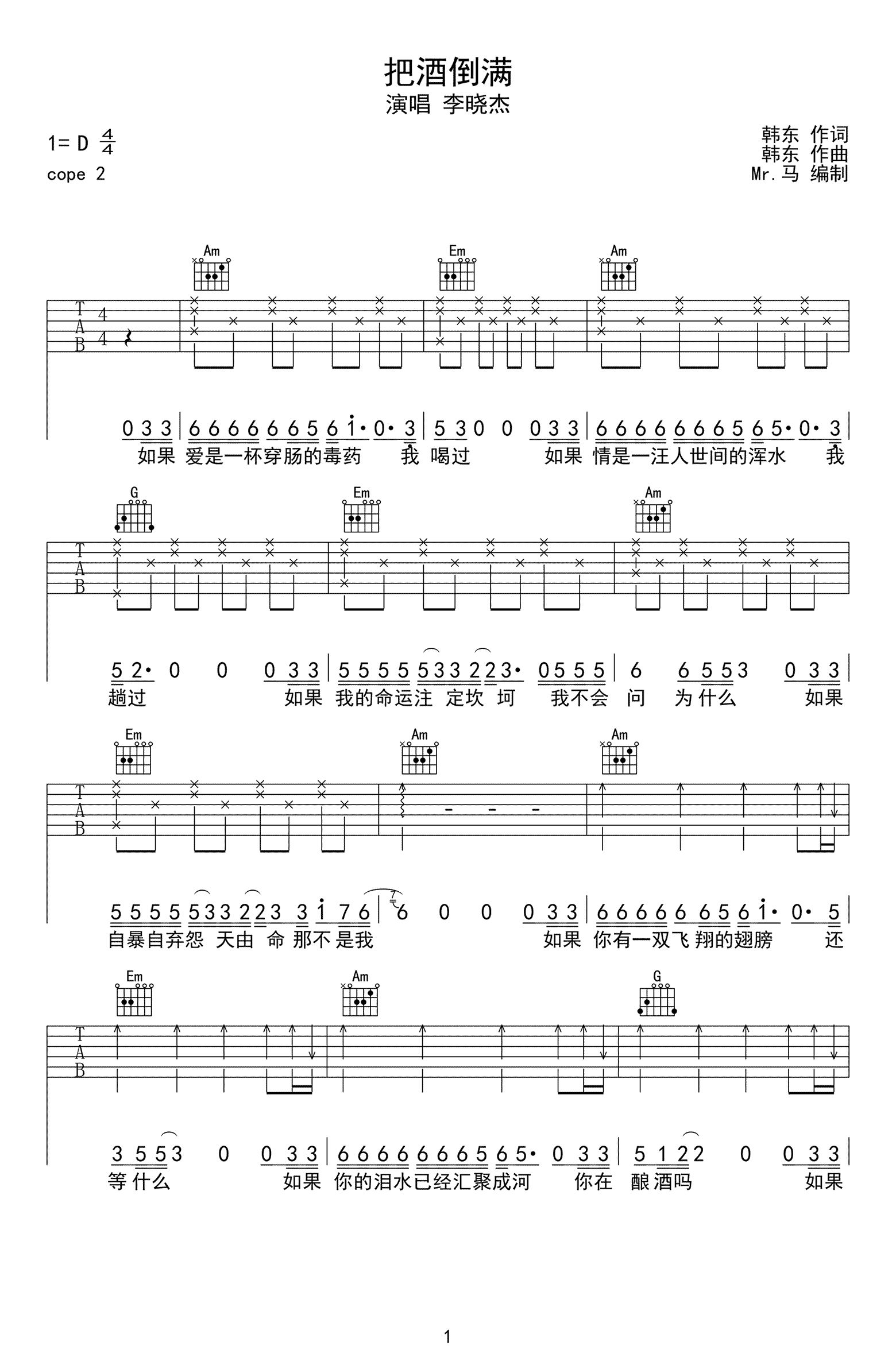 曲谱介绍: 李晓杰《把酒倒满》吉他弹唱谱,采用C调指法编配,共有3张高清图谱。