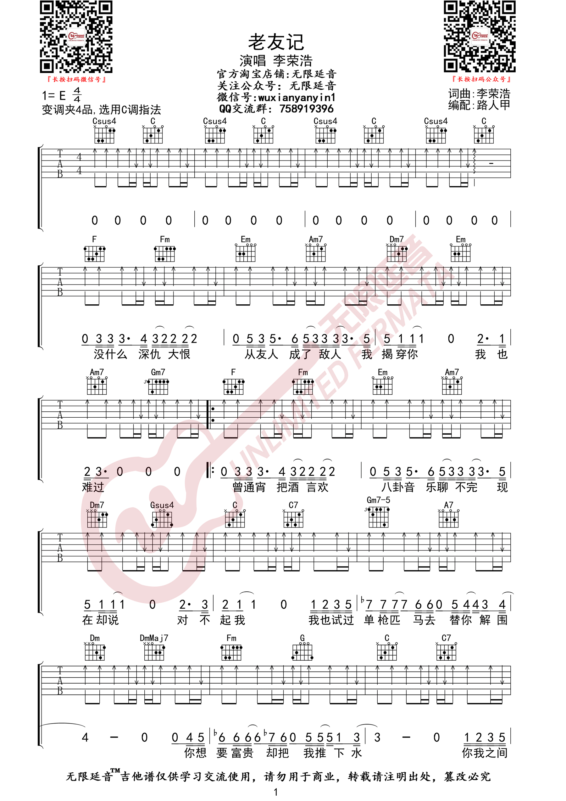 曲谱介绍: 李荣浩《老友记》吉他弹唱谱,采用C调指法编配,共有3张高清图谱。