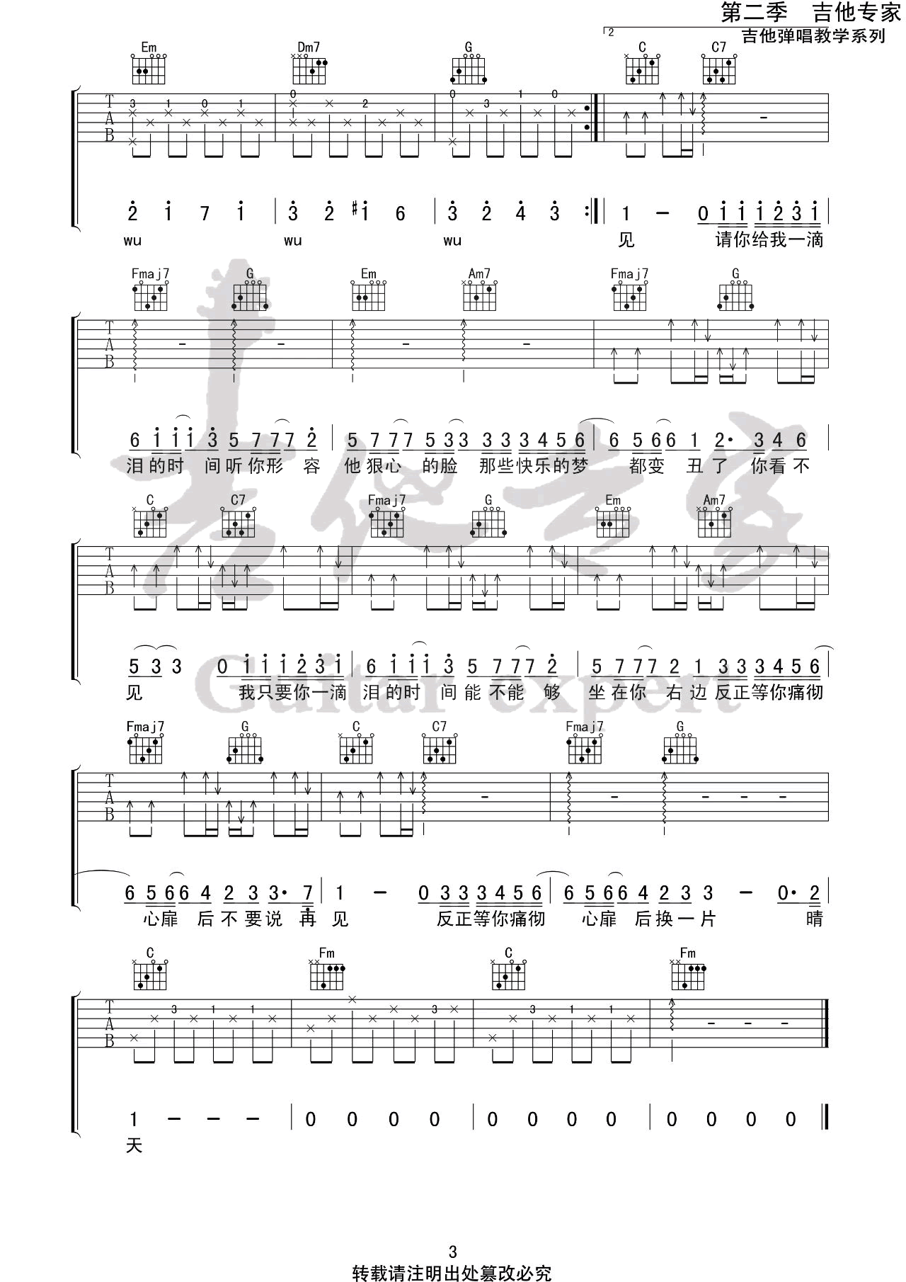 曲谱介绍: 赵紫骅《一滴泪的时间》吉他弹唱谱,采用C调指法编配,共有3张高清图谱。
