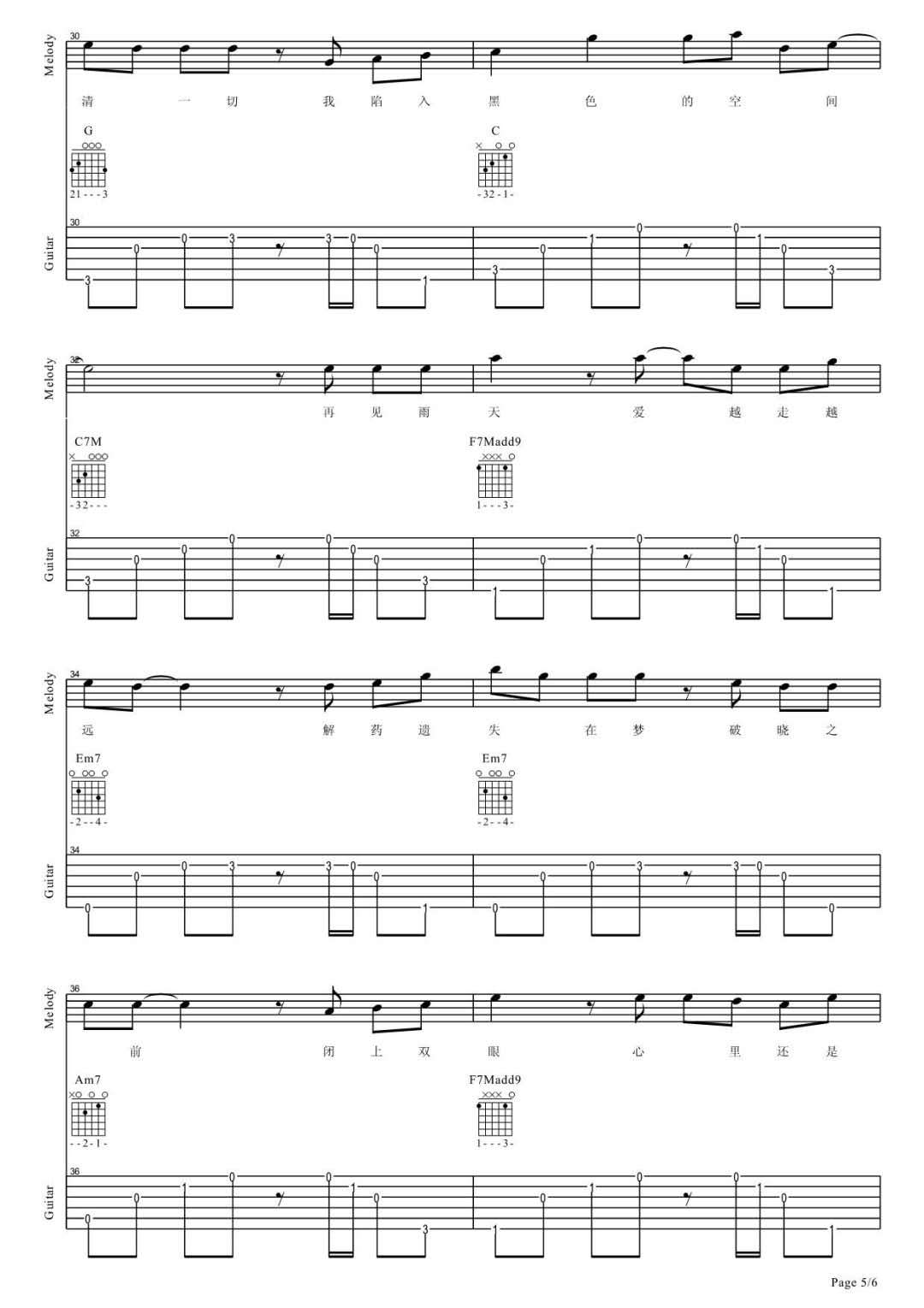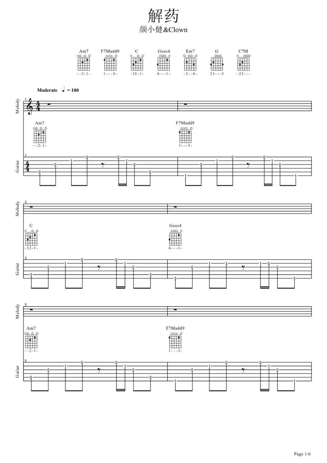 曲谱介绍: 颜小健《解药》吉他弹唱谱,采用C调指法编配,共有6张高清图谱。