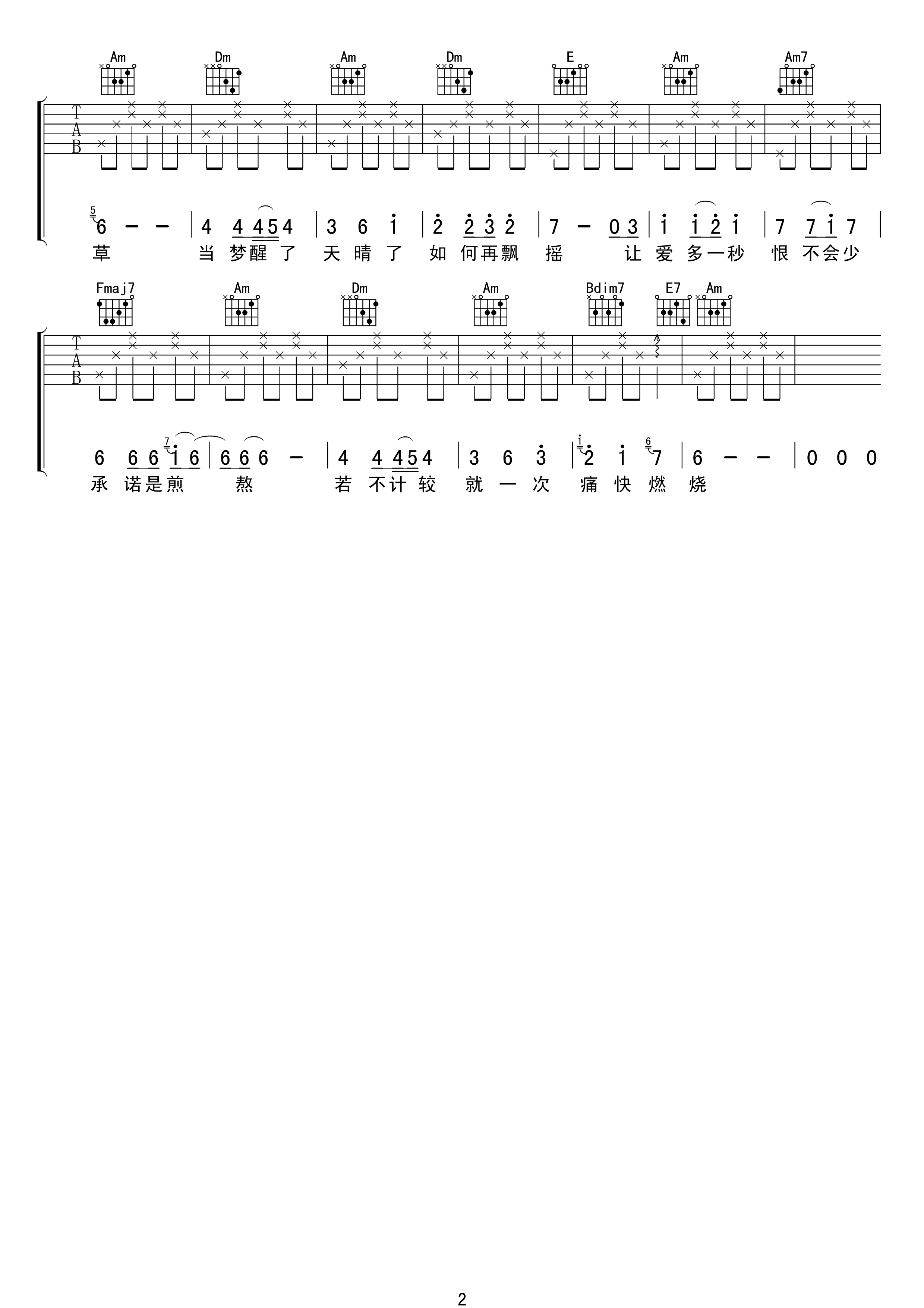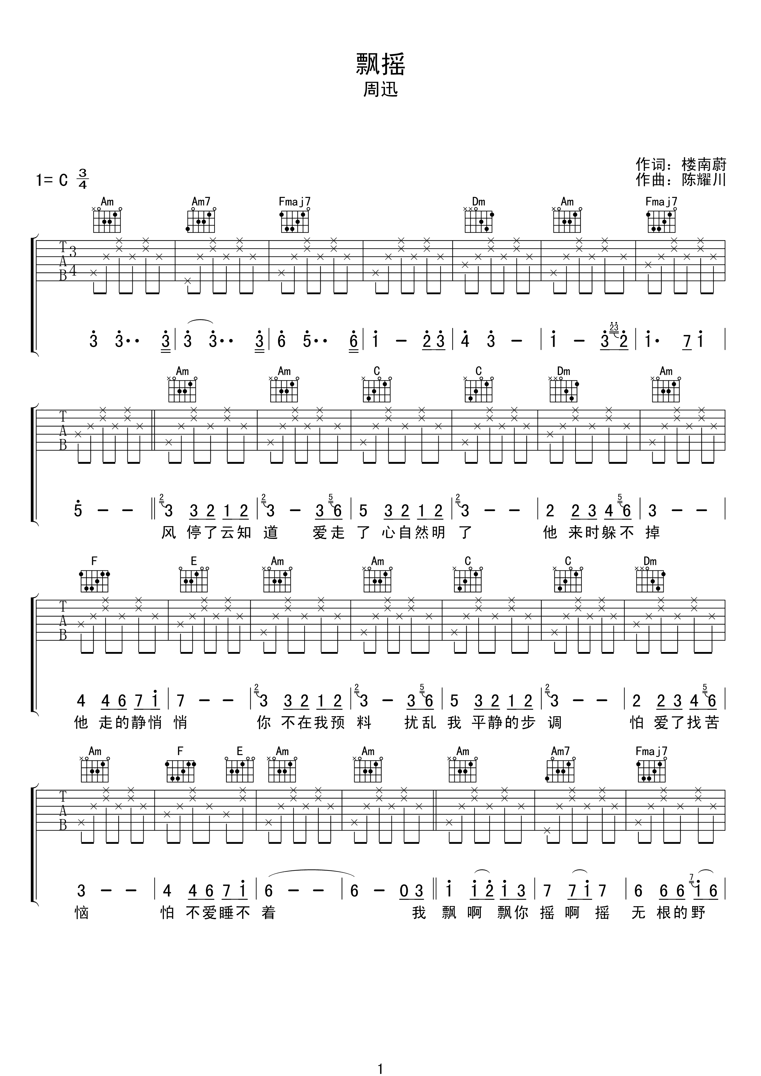 曲谱介绍: 周迅《飘摇》吉他弹唱谱,采用C调指法编配,共有2张高清图谱,免翻页排版设计。