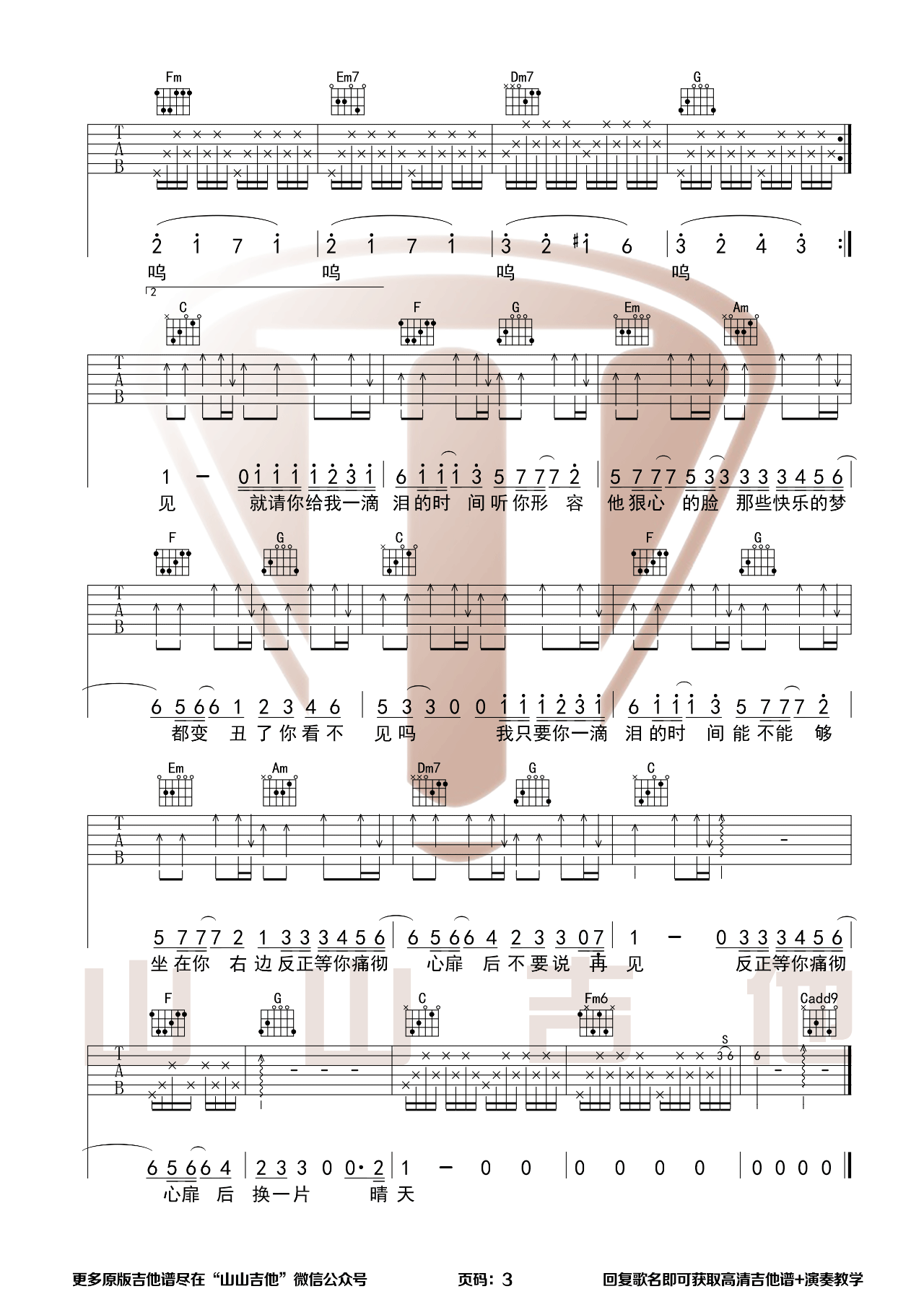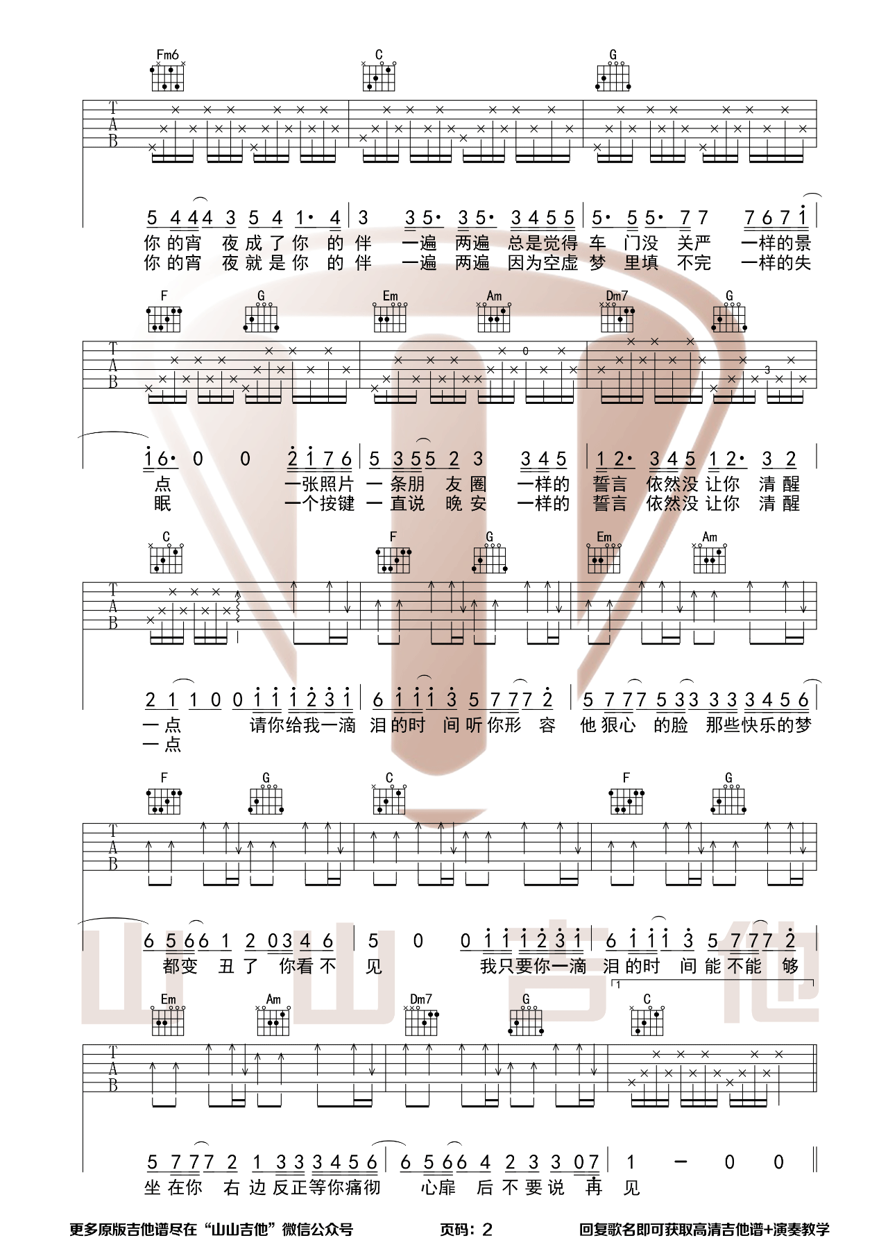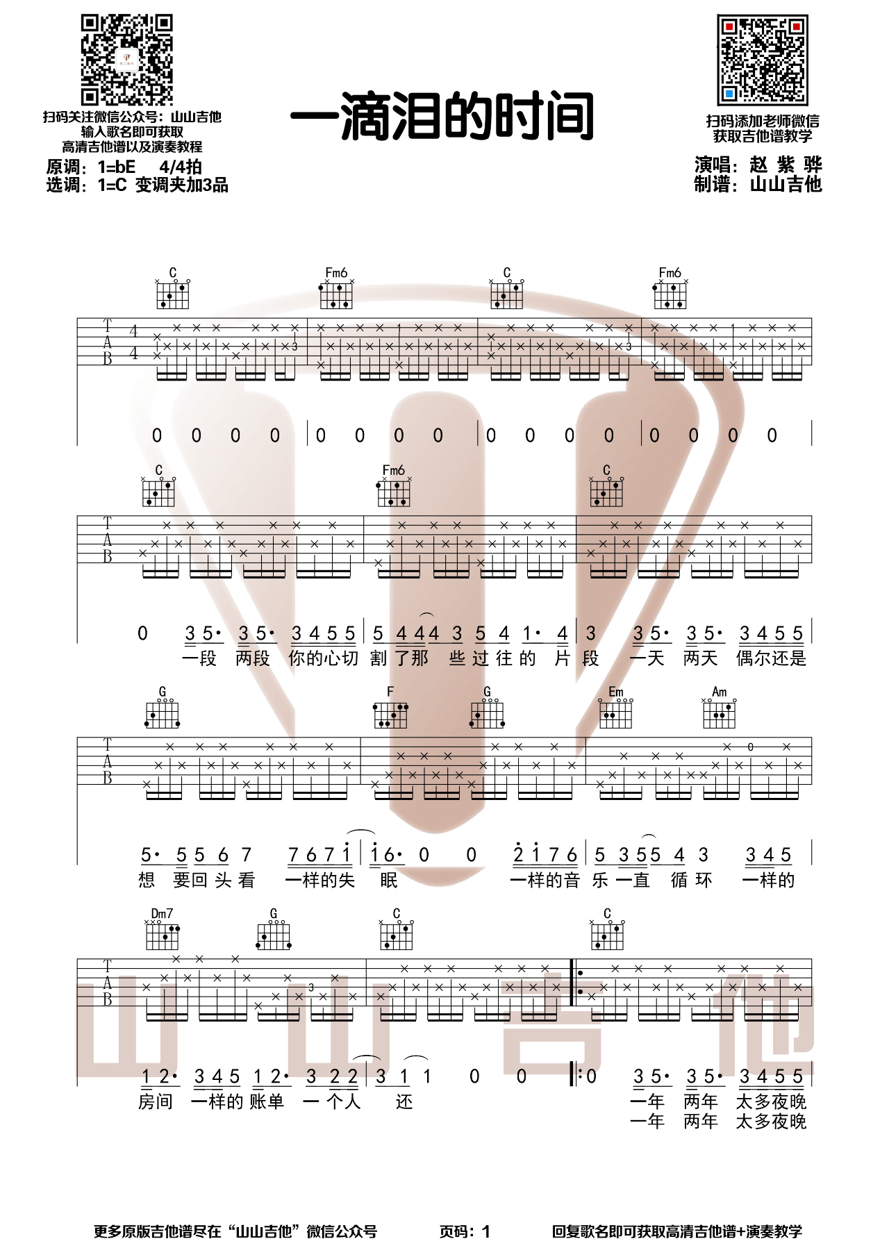 曲谱介绍: 赵紫骅《一滴泪的时间》吉他弹唱谱,采用C调指法编配原版,共有3张高清图谱。