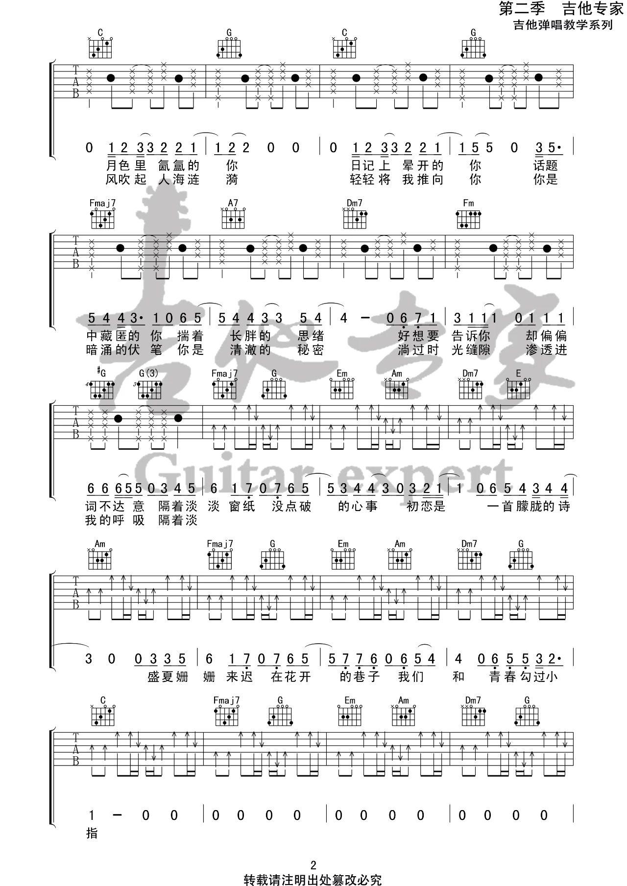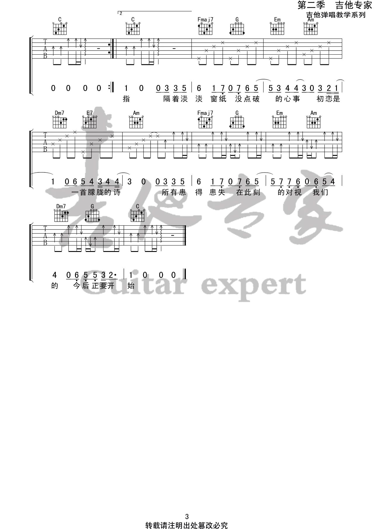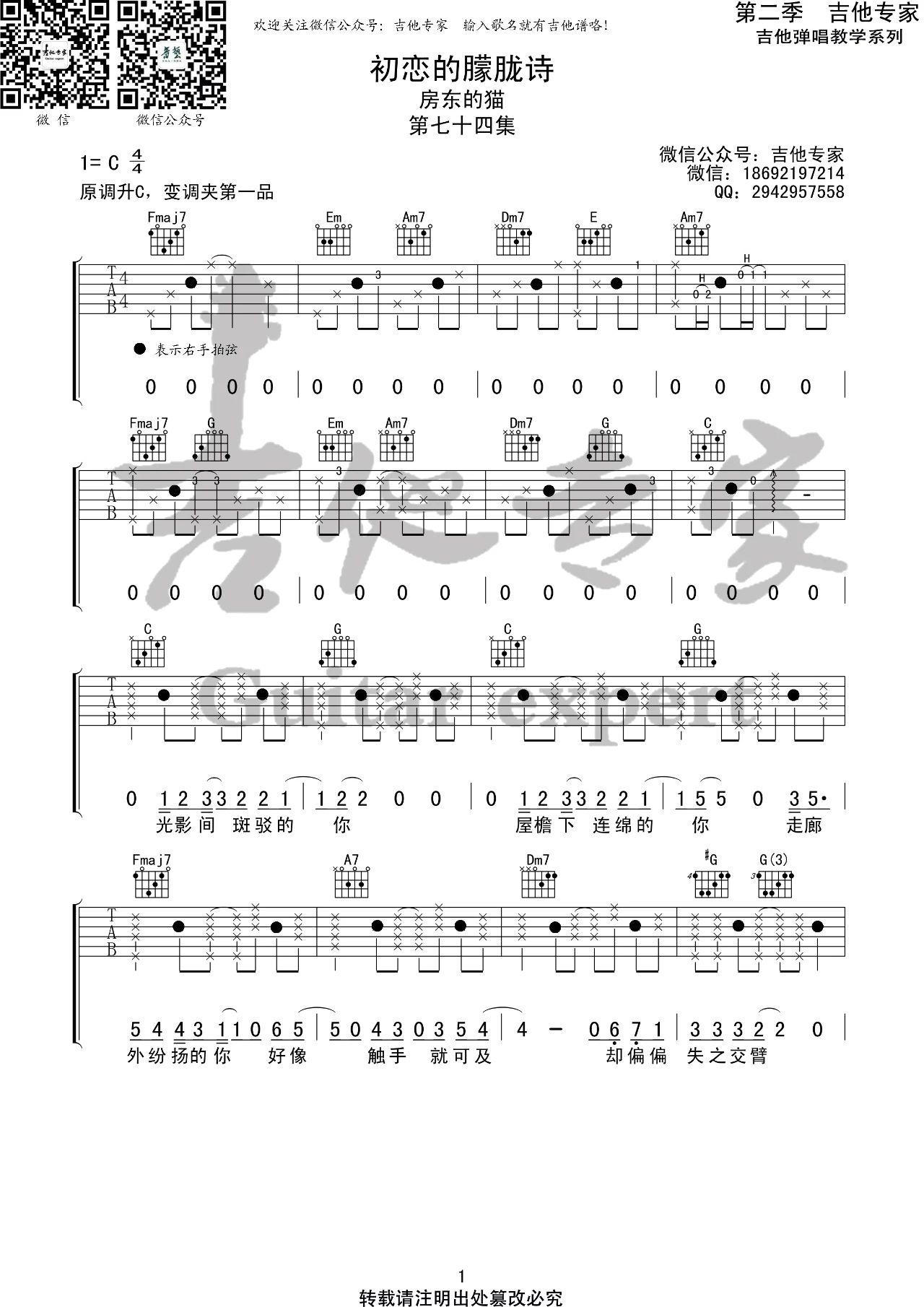 曲谱介绍: 房东的猫《初恋的朦胧诗》吉他弹唱谱,采用C调指法编配,共有3张高清图谱。