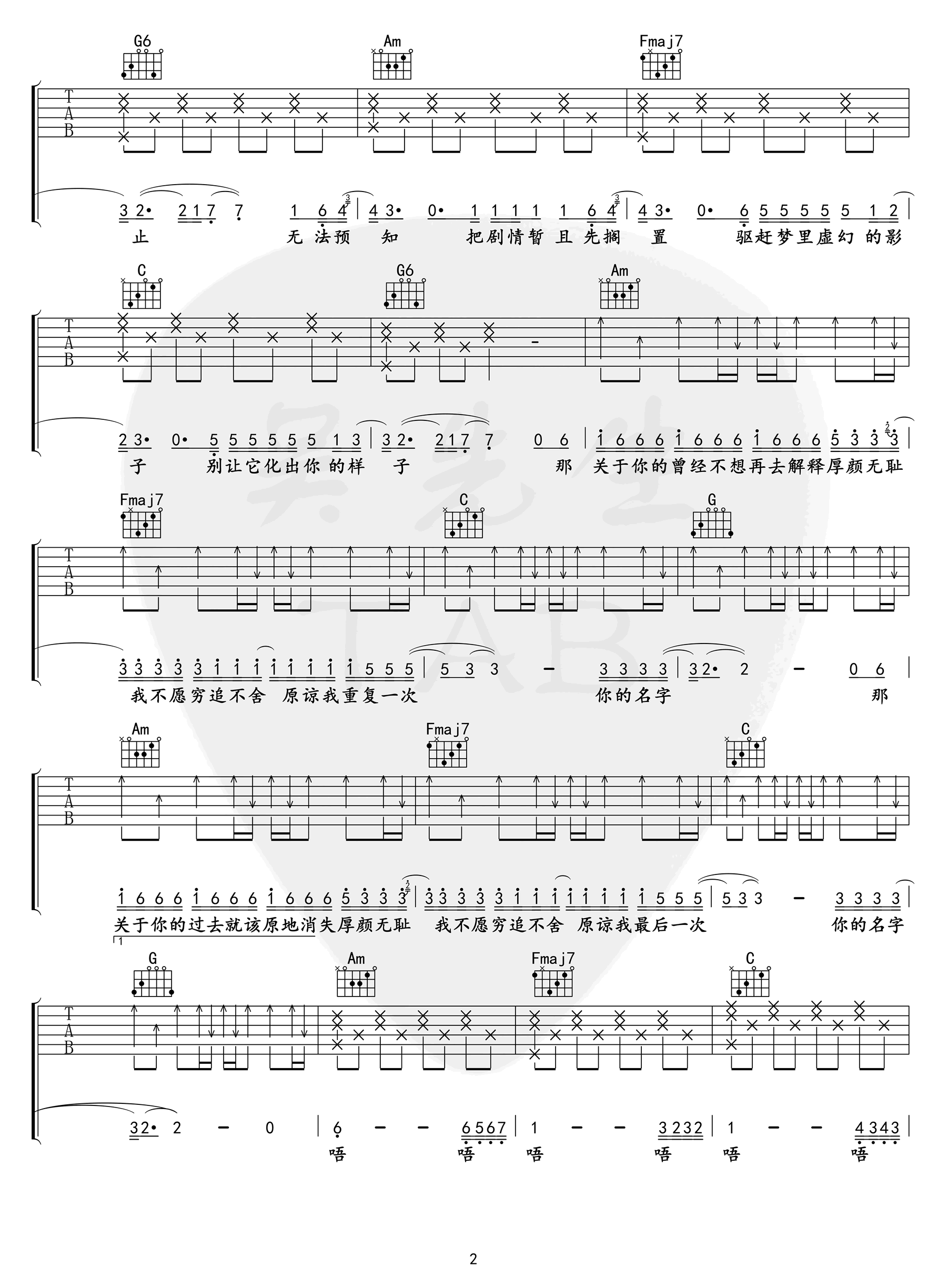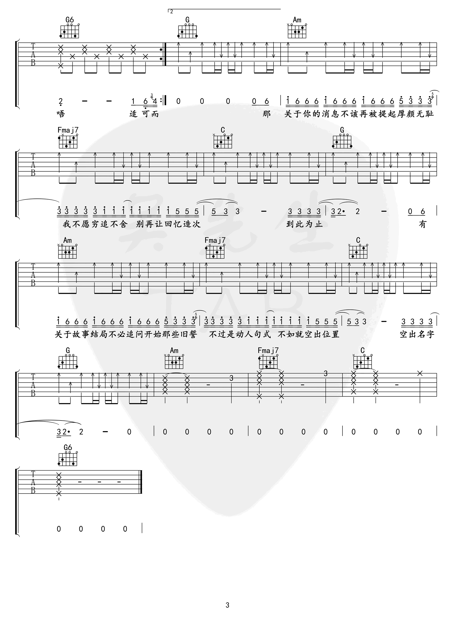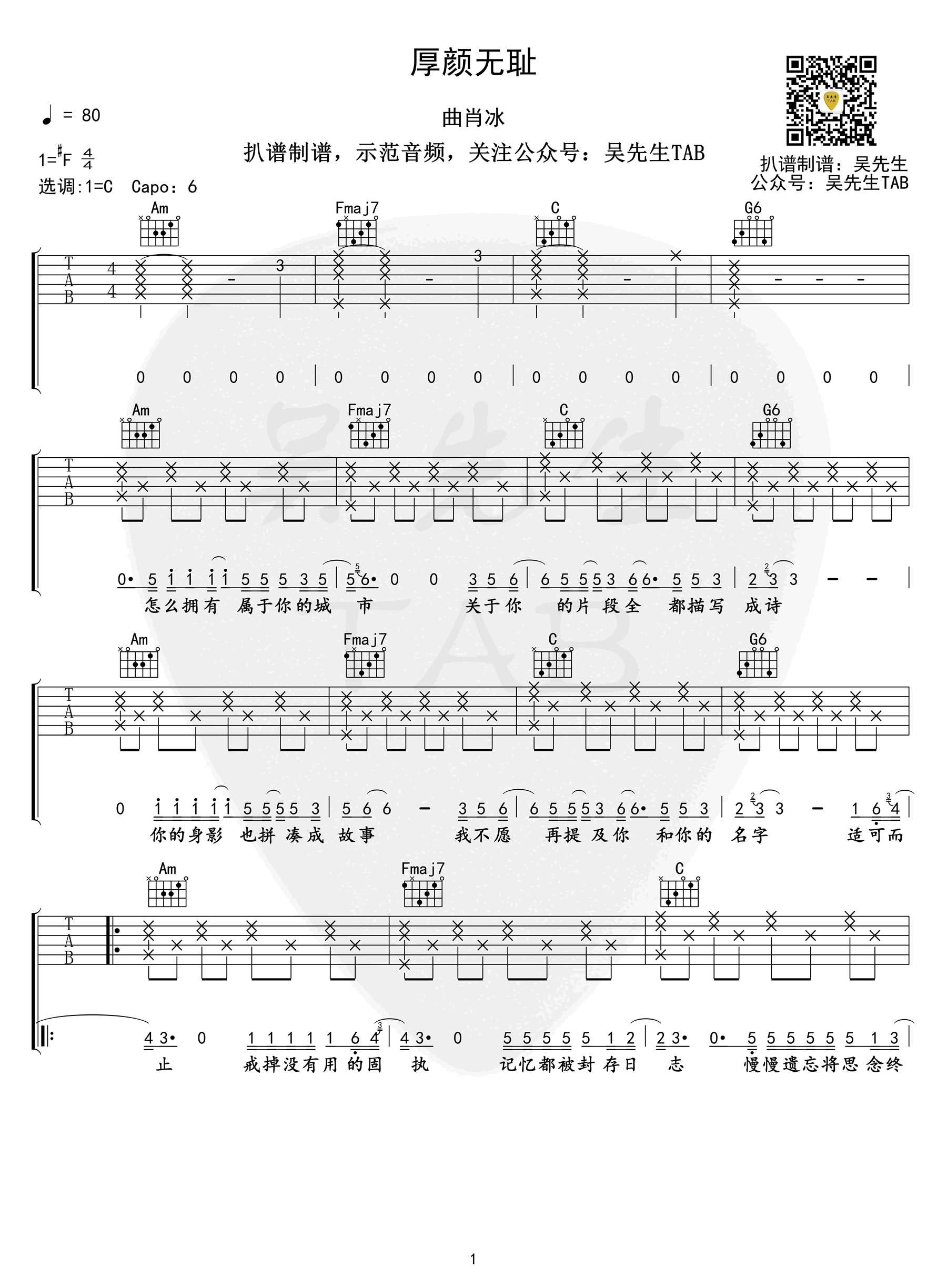 曲谱介绍: 曲肖冰《厚颜无耻》吉他弹唱谱,采用C调指法编配原版,共有3张高清图谱。