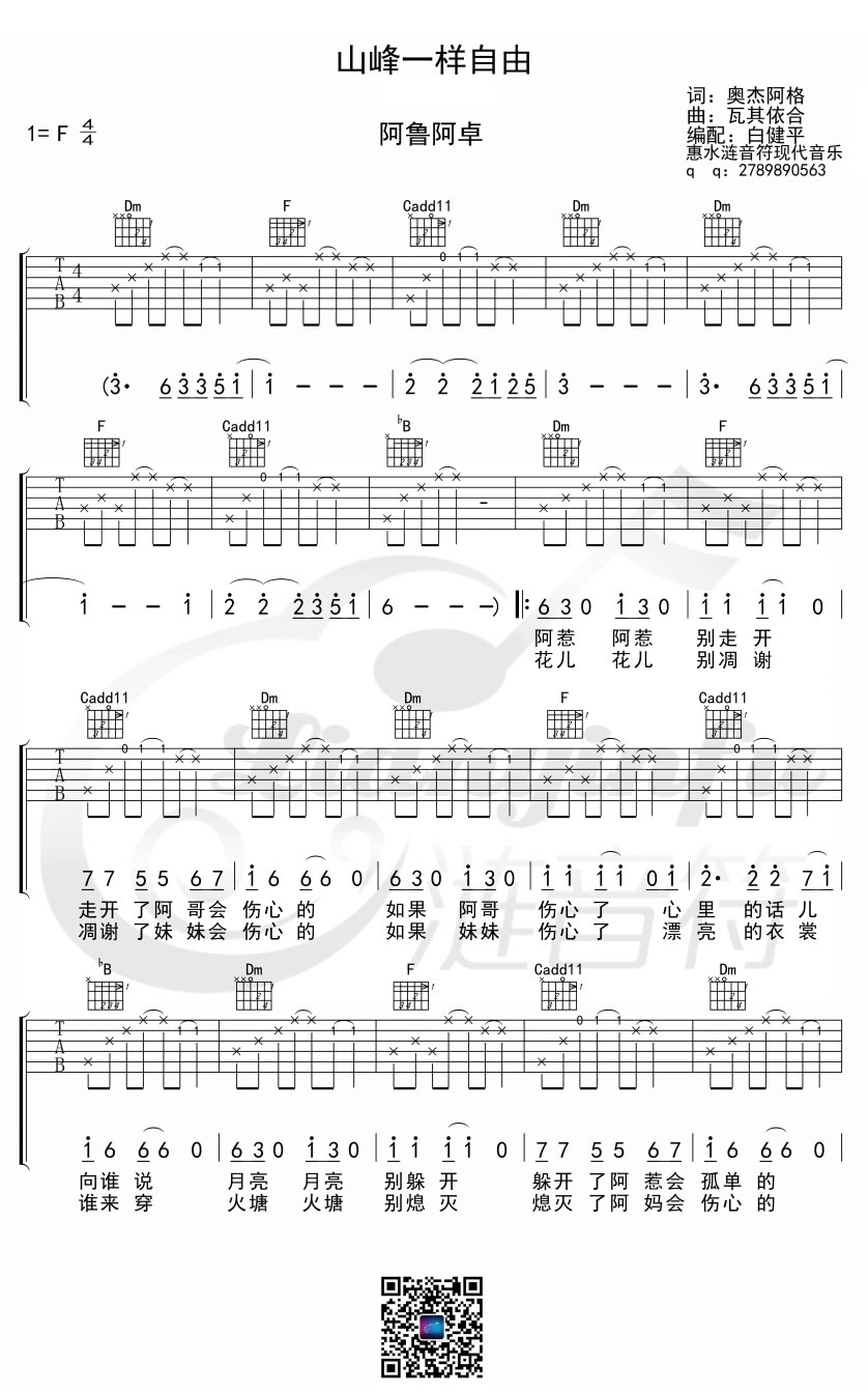 曲谱介绍: 阿鲁阿卓/山风组合《山风一样自由》吉他弹唱谱,采用F调指法编配,共有3张高清图谱。